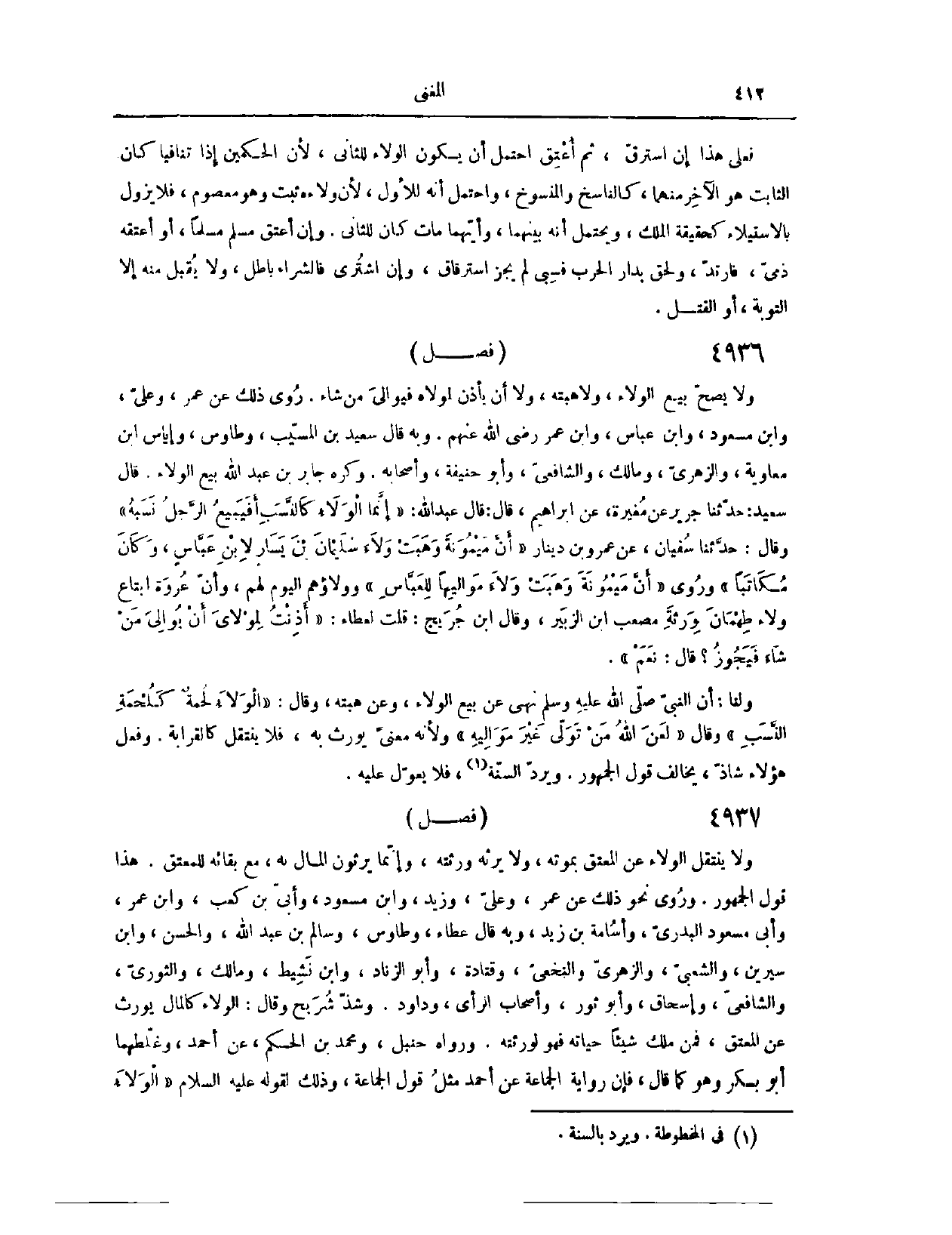 (٤٩٩٨) فَصْلٌ: وَلَا يَصِحُّ بَيْعُ الْوَلَاءِ وَلَا هِبَتُهُ، وَلَا أَنْ يَأْذَنَ لِمَوْلَاهُ فَيُوَالِي مَنْ شَاءَ. رُوِيَ ذَلِكَ عَنْ عُمَرَ، وَعَلِيٍّ، وَابْنِ مَسْعُودٍ، وَابْنِ عَبَّاسٍ، وَابْنِ عُمَرَ - رَضِيَ اللَّهُ عَنْهُمْ -. وَبِهِ قَالَ سَعِيدُ بْنِ الْمُسَيِّبِ، وَطَاوُسٌ، وَإِيَاسُ بْنُ مُعَاوِيَةَ، وَالزُّهْرِيُّ، وَمَالِكٌ، وَالشَّافِعِيُّ، وَأَبُو حَنِيفَةَ وَأَصْحَابُهُ. وَكَرِهَ جَابِرُ بْنُ عَبْدِ اللَّهِ بَيْعَ الْوَلَاءِ. قَالَ سَعِيدٌ: حَدَّثَنَا جَرِيرٌ، عَنْ مُغِيرَةَ، عَنْ إبْرَاهِيمَ قَالَ: قَالَ عَبْدُ اللَّهِ: إنَّمَا الْوَلَاءُ كَالنَّسَبِ فَيَبِيعُ الرَّجُلُ نَسَبَهُ،.