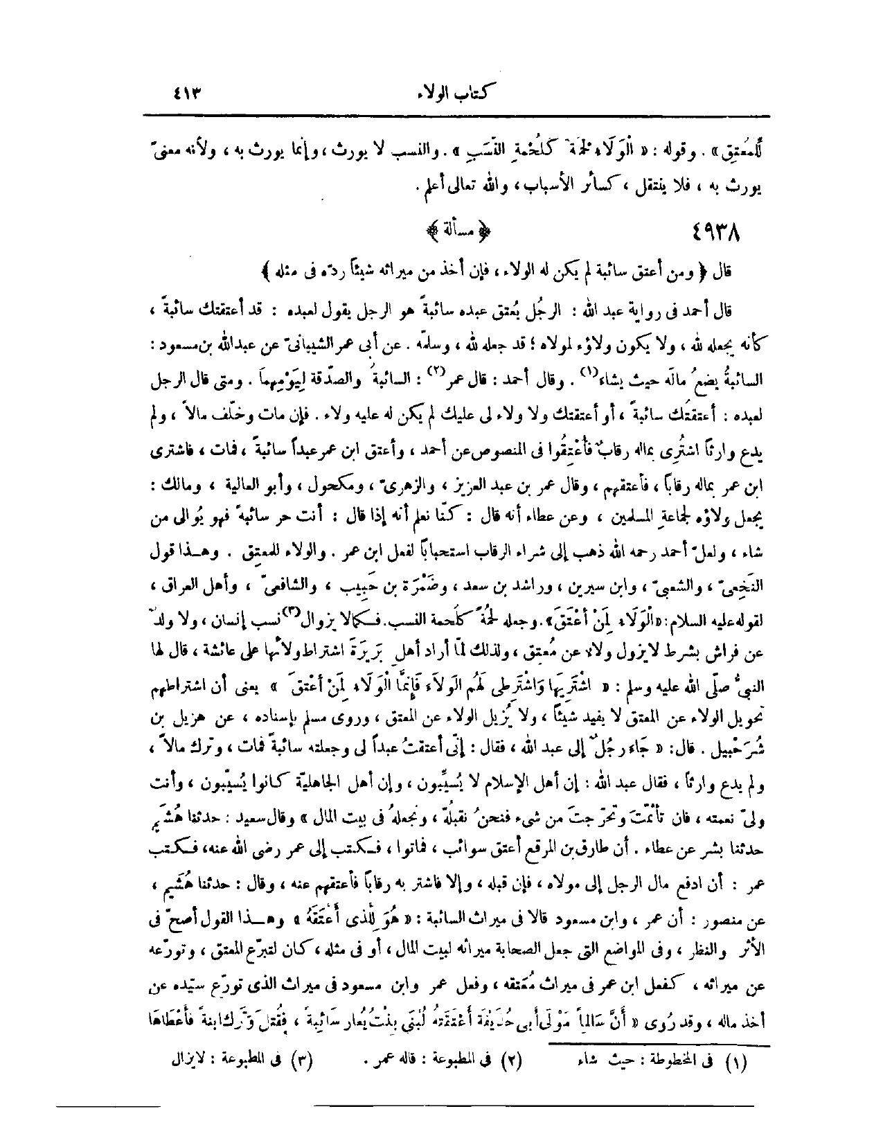 (٥٠٠٠) مَسْأَلَةٌ؛ قَالَ: (وَمَنْ أَعْتَقَ سَائِبَةً، لَمْ يَكُنْ لَهُ الْوَلَاءُ، فَإِنْ أَخَذَ مِنْ مِيرَاثِهِ شَيْئًا، رَدَّهُ فِي مِثْلِهِ) قَالَ أَحْمَدُ، فِي رِوَايَةِ عَبْدِ اللَّهِ: الرَّجُلُ يُعْتِقُ عَبْدَهُ سَائِبَةً، هُوَ الرَّجُلُ يَقُولُ لِعَبْدِهِ: قَدْ أَعْتَقْتُك سَائِبَةً. كَأَنَّهُ يَجْعَلُهُ لِلَّهِ، لَا يَكُونُ وَلَاؤُهُ لِمَوْلَاهُ، قَدْ جَعَلَهُ لِلَّهِ وَسَلَّمَهُ. عَنْ أَبِي عَمْرٍو الشَّيْبَانِيِّ، عَنْ عَبْدِ اللَّهِ بْنِ مَسْعُودٍ: السَّائِبَةُ يَضَعُ مَالَهُ حَيْثُ شَاءَ. وَقَالَ أَحْمَدُ، قَالَ عُمَرُ: السَّائِبَةُ وَالصَّدَقَةُ لِيَوْمِهَا.