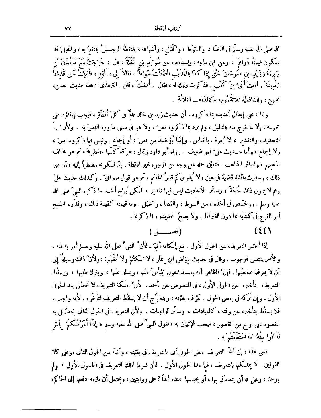 وَلِأَنَّ التَّحْدِيدَ وَالتَّقْدِيرَ لَا يُعْرَفُ بِالْقِيَاسِ، وَإِنَّمَا يُؤْخَذُ مِنْ نَصٍّ أَوْ إجْمَاعٍ، وَلَيْسَ فِيمَا ذَكَرُوهُ نَصٌّ وَلَا إجْمَاعٌ. وَأَمَّا حَدِيثُ عَلِيٍّ، فَهُوَ ضَعِيفٌ، رَوَاهُ أَبُو دَاوُد وَقَالَ: طُرُقُهُ كُلُّهَا مُضْطَرِبَةٌ. ثُمَّ هُوَ مُخَالِفٌ لِمَذْهَبِهِمْ وَلِسَائِرِ الْمَذَاهِبِ، فَتَعَيَّنَ حَمْلُهُ عَلَى وَجْهٍ مِنْ الْوُجُوهِ غَيْرِ اللُّقَطَةِ، إمَّا لِكَوْنِهِ مُضْطَرًّا إلَيْهِ أَوْ غَيْرِ ذَلِكَ، وَحَدِيثُ عَائِشَةَ قَضِيَّةٌ فِي عَيْنٍ، لَا يُدْرَى كَمْ قَدْرُ الْخَاتَمِ، ثُمَّ هُوَ قَوْلُ صَحَابِيٍّ، وَكَذَلِكَ حَدِيثُ عَلِيٍّ، وَهُمْ لَا يَرَوْنَ ذَلِكَ حُجَّةً، وَسَائِرُ الْأَحَادِيثِ لَيْسَ فِيهَا تَقْدِيرٌ، لَكِنْ يُبَاحُ أَخْذُ مَا ذَكَرَهُ النَّبِيُّ - صَلَّى اللَّهُ عَلَيْهِ وَسَلَّمَ - وَخَصَّ فِي أَخْذِهِ مِنْ السَّوْطِ وَالْعَصَا وَالْحَبْلِ، وَمَا قِيمَتُهُ كَقِيمَةِ ذَلِكَ