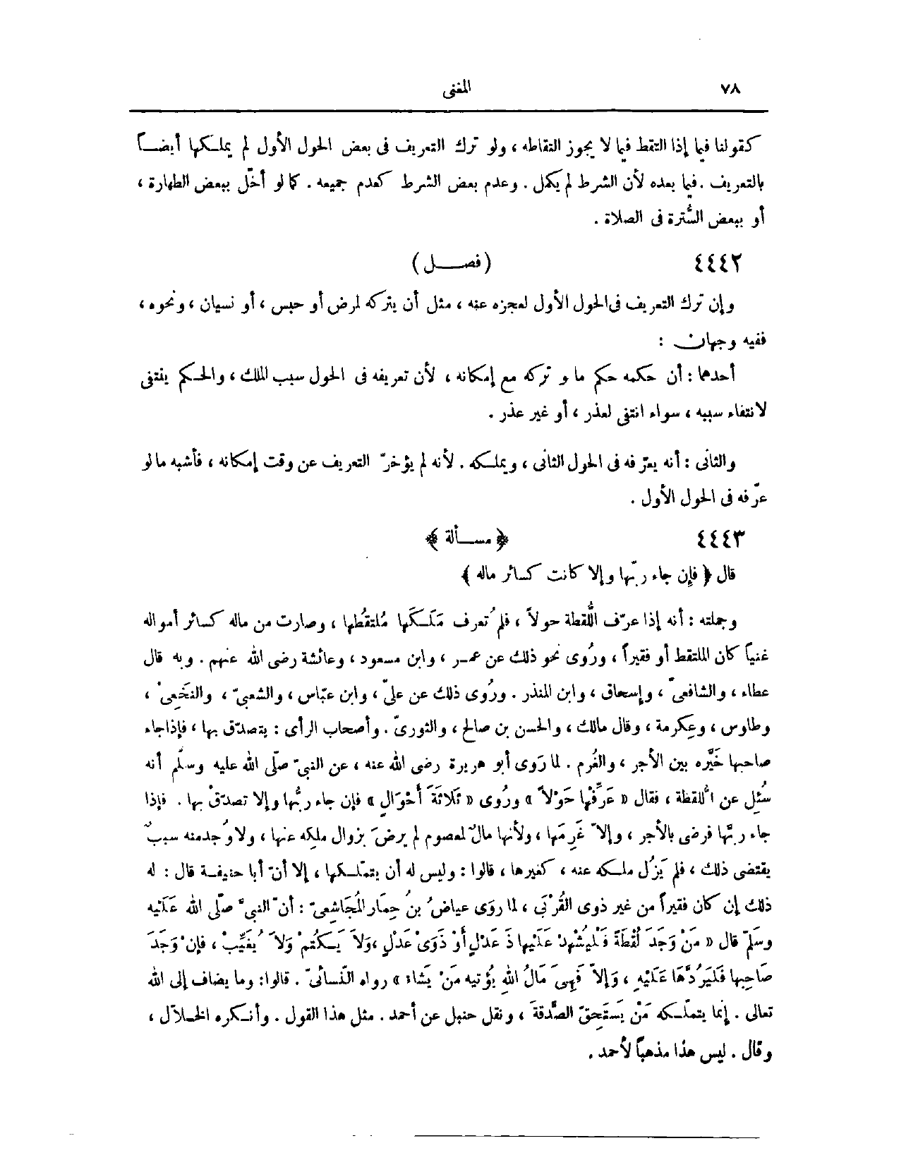 (٤٥٠٣) مَسْأَلَةٌ قَالَ: (فَإِنْ جَاءَ رَبُّهَا، وَإِلَّا كَانَتْ كَسَائِرِ مَالِهِ) وَجُمْلَتُهُ أَنَّهُ إذَا عَرَّفَ اللُّقَطَةَ حَوْلًا، فَلَمْ تُعْرَفْ، مَلَكَهَا مُلْتَقِطُهَا، وَصَارَتْ مِنْ مَالِهِ، كَسَائِرِ أَمْوَالِهِ، غَنِيًّا كَانَ الْمُلْتَقِطُ أَوْ فَقِيرًا. وَرُوِيَ نَحْوُ ذَلِكَ عَنْ عُمَرَ، وَابْنِ مَسْعُودٍ، وَعَائِشَةَ - رَضِيَ اللَّهُ عَنْهُمْ -. وَبِهِ قَالَ عَطَاءٌ، وَالشَّافِعِيُّ، وَإِسْحَاقُ، وَابْنُ الْمُنْذِرِ. وَرُوِيَ ذَلِكَ عَنْ عَلِيٍّ، وَابْنِ عَبَّاسٍ، وَالشَّعْبِيِّ، وَالنَّخَعِيِّ، وَطَاوُسٍ، وَعِكْرِمَةَ