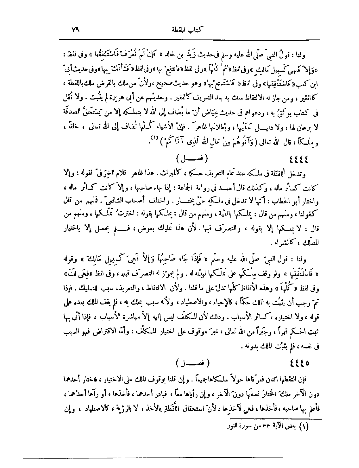 (٤٥٠٤) فَصْلٌ: وَتَدْخُلُ اللُّقَطَةُ فِي مِلْكِهِ عِنْدَ تَمَامِ التَّعْرِيفِ حُكْمًا، كَالْمِيرَاثِ. هَذَا ظَاهِرُ كَلَامِ الْخِرَقِيِّ؛ لِقَوْلِهِ: " وَإِلَّا كَانَتْ كَسَائِرِ مَالِهِ ". وَكَذَلِكَ قَالَ أَحْمَدُ فِي رِوَايَةِ الْجَمَاعَةِ: إذَا جَاءَ صَاحِبُهَا، وَإِلَّا كَانَتْ كَسَائِرِ مَالِهِ. وَاخْتَارَ أَبُو الْخَطَّابِ أَنَّهَا لَا تَدْخُلُ فِي مِلْكِهِ حَتَّى يَخْتَارَ. وَاخْتَلَفَ أَصْحَابُ الشَّافِعِيِّ؛ فَمِنْهُمْ مَنْ قَالَ كَقَوْلِنَا، وَمِنْهُمْ مَنْ قَالَ: يَمْلِكُهَا بِالنِّيَّةِ
