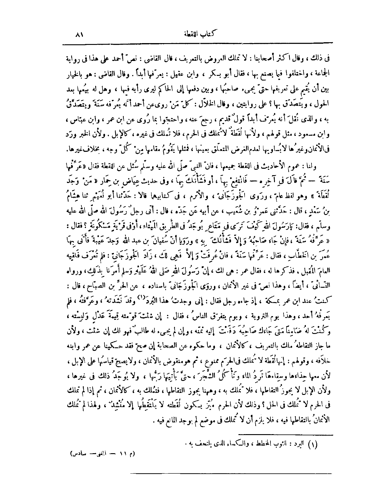 وَهَذَا نَصٌّ فِي غَيْرِ الْأَثْمَانِ. وَرَوَى الْجُوزَجَانِيُّ بِإِسْنَادِهِ، عَنْ الْحُرِّ بْنِ الصَّبَّاحِ قَالَ: كُنْت عِنْدَ ابْنِ عُمَرَ بِمَكَّةَ، إذْ جَاءَهُ رَجُلٌ. فَقَالَ: إنِّي وَجَدْت هَذَا الْبُرْدَ، وَقَدْ نَشَدْته وَعَرَّفْته فَلَمْ يَعْرِفْهُ أَحَدٌ، وَهَذَا يَوْمُ التَّرْوِيَةِ، وَيَوْمُ يَتَفَرَّقُ النَّاسُ. فَقَالَ: إنْ شِئْت قَوَّمْته قِيمَةَ عَدْلٍ، وَلَبِسْته، وَكُنْت لَهُ ضَامِنًا، مَتَى جَاءَك صَاحِبُهُ دَفَعْت إلَيْهِ ثَمَنَهُ، وَإِنْ لَمْ يَجِئْ لَهُ طَالِبٌ فَهُوَ لَك إنْ شِئْت