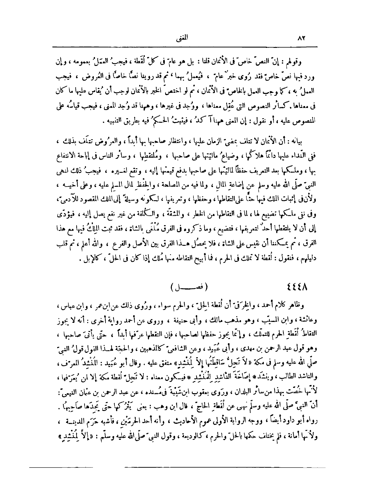 (٤٥٠٨) فَصْلٌ: وَظَاهِرُ كَلَامِ أَحْمَدَ وَالْخِرَقِيِّ، أَنَّ لُقَطَةَ الْحِلِّ وَالْحَرَمِ سَوَاءٌ. وَرُوِيَ ذَلِكَ عَنْ ابْنِ عُمَرَ، وَابْنِ عَبَّاسٍ، وَعَائِشَةَ، وَابْنِ الْمُسَيِّبِ. وَهُوَ مَذْهَبُ مَالِكٍ، وَأَبِي حَنِيفَةَ. وَرُوِيَ عَنْ أَحْمَدَ رِوَايَةٌ أُخْرَى، أَنَّهُ لَا يَجُوزُ الْتِقَاطُ لُقَطَةُ الْحَرَمِ لِلتَّمَلُّكِ، وَإِنَّمَا يَجُوزُ حِفْظُهَا لِصَاحِبِهَا، فَإِنْ الْتَقَطَهَا عَرَّفَهَا أَبَدًا حَتَّى يَأْتِيَ صَاحِبُهَا. وَهُوَ قَوْلُ عَبْدِ الرَّحْمَنِ بْنِ مَهْدِيٍّ، وَأَبِي عُبَيْدٍ. وَعَنْ الشَّافِعِيِّ كَالْمَذْهَبَيْنِ. وَالْحُجَّةُ لِهَذَا الْقَوْلِ قَوْلُ النَّبِيِّ - صَلَّى اللَّهُ عَلَيْهِ وَسَلَّمَ - فِي مَكَّةَ: «لَا تَحِلُّ سَاقِطَتُهَا إلَّا لِمُنْشِدٍ» . مُتَّفَقٌ عَلَيْهِ