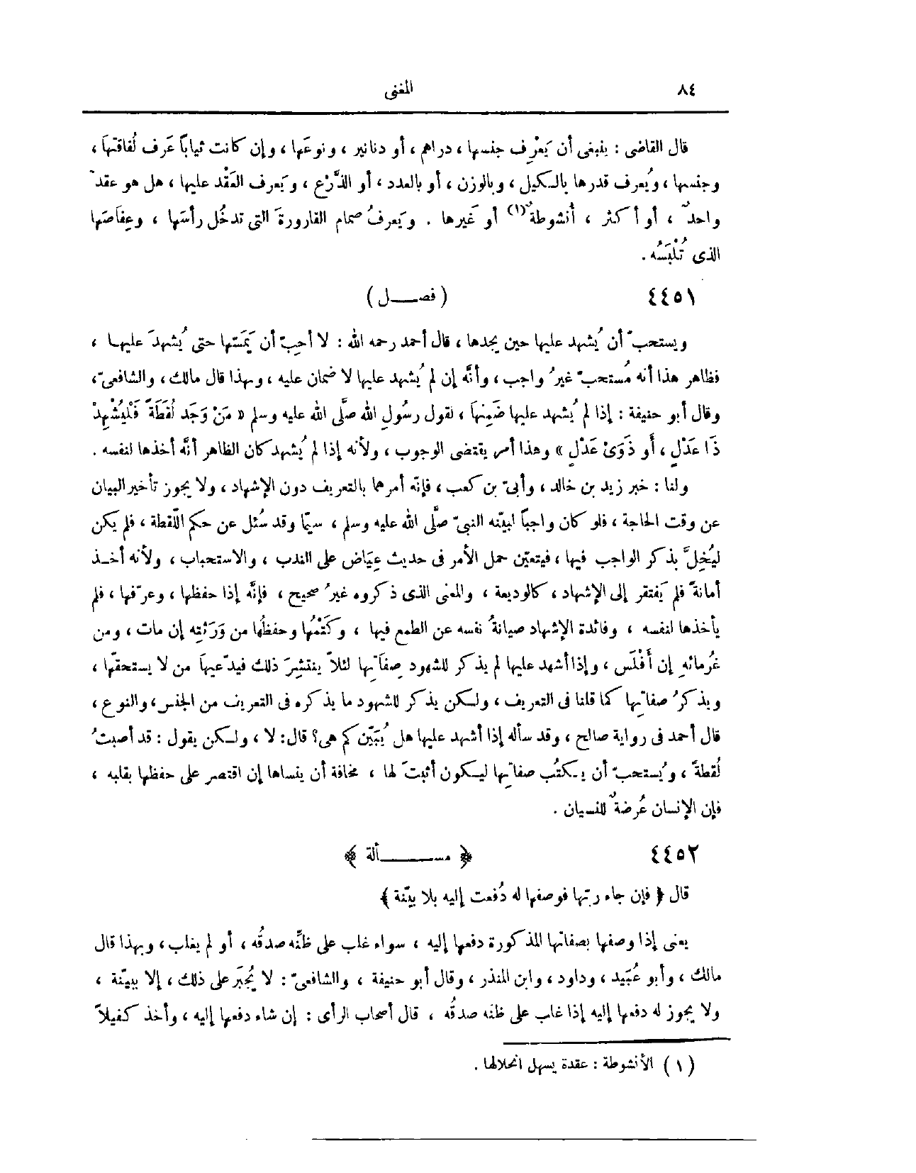 (٤٥١١) فَصْلٌ: وَيُسْتَحَبُّ أَنْ يُشْهِدَ عَلَيْهَا حِينَ يَجِدُهَا. قَالَ أَحْمَدُ، - رَحِمَهُ اللَّهُ -: لَا أُحِبُّ أَنْ يَمَسّهَا حَتَّى يُشْهِدَ عَلَيْهَا. فَظَاهِرُ هَذَا أَنَّهُ مُسْتَحَبٌّ غَيْرُ وَاجِبٍ، وَأَنَّهُ إنْ لَمْ يُشْهِدْ عَلَيْهَا لَا ضَمَانَ عَلَيْهِ. وَبِهَذَا قَالَ مَالِكٌ