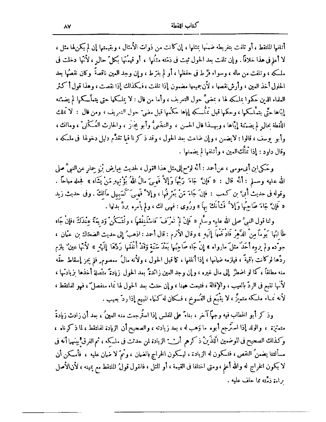 فَجَعَلَهُ مُبَاحًا. وَقَوْلِهِ فِي حَدِيثِ أُبَيِّ بْنِ كَعْبٍ: «فَإِنْ جَاءَ مَنْ يَعْرِفُهَا، وَإِلَّا فَهِيَ كَسَبِيلِ مَالِك» . وَفِي حَدِيثِ زَيْدٍ: «فَإِنْ جَاءَ صَاحِبُهَا، وَإِلَّا فَشَأْنَك بِهَا» . وَرُوِيَ: " فَهِيَ لَك ". وَلَمْ يَأْمُرْهُ بِرَدِّ بَدَلَهَا. وَلَنَا قَوْلُ النَّبِيِّ - صَلَّى اللَّهُ عَلَيْهِ وَسَلَّمَ -: «فَإِنْ لَمْ تُعْرَفْ فَاسْتَنْفِقْهَا، وَلْتَكُنْ وَدِيعَةً عِنْدَك، فَإِنْ جَاءَ طَالِبُهَا يَوْمًا مِنْ الدَّهْرِ، فَادْفَعْهَا إلَيْهِ» . وَقَالَ الْأَثْرَمُ: قَالَ أَحْمَدُ: أَذْهَبُ إلَى حَدِيثِ الضَّحَّاكِ بْنِ عُثْمَانَ. جَوَّدَهُ، وَلَمْ يَرْوِهِ أَحَدٌ مِثْلَ مَا رَوَاهُ: «إنْ جَاءَ صَاحِبُهَا بَعْدَ سَنَةٍ، وَقَدْ أَنْفَقَهَا، رَدَّهَا إلَيْهِ»