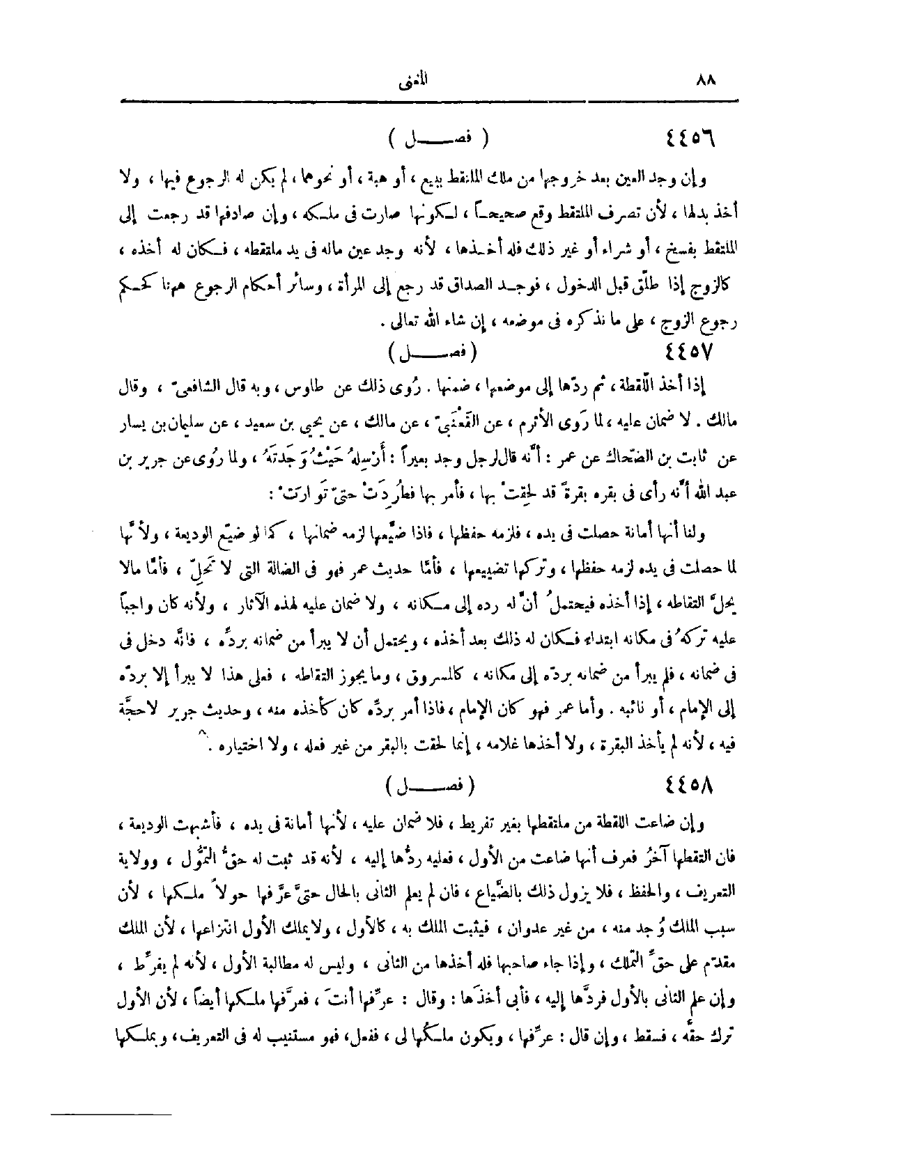 (٤٥١٧) فَصْلٌ: إذَا أَخَذَ اللُّقَطَةَ، ثُمَّ رَدَّهَا إلَى مَوْضِعِهَا، ضَمِنَهَا. رُوِيَ ذَلِكَ عَنْ طَاوُسٍ. وَبِهِ قَالَ الشَّافِعِيُّ. وَقَالَ مَالِكٌ: لَا ضَمَانَ عَلَيْهِ؛ لِمَا رَوَى الْأَثْرَمُ، عَنْ الْقَعْنَبِيِّ، عَنْ مَالِكٍ عَنْ يَحْيَى بْنِ سَعِيدٍ عَنْ سُلَيْمَانَ بْنَ يَسَارٍ، عَنْ ثَابِتِ بْنِ الضَّحَّاكِ، عَنْ عُمَرَ، أَنَّهُ قَالَ لِرَجُلٍ وَجَدَ بَعِيرًا: أَرْسِلْهُ حَيْثُ وَجَدَتْهُ. وَلِمَا رُوِيَ عَنْ جَرِيرِ بْنِ عَبْدِ اللَّهِ، أَنَّهُ رَأَى فِي بَقَرِهِ بَقَرَةً قَدْ لَحِقَتْ بِهَا، فَأَمَرَ بِهَا فَطُرِدَتْ حَتَّى تَوَارَتْ