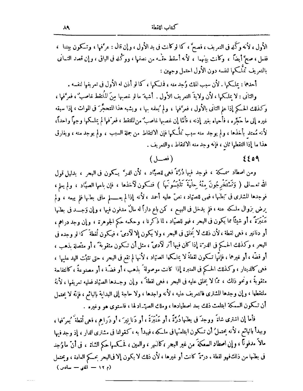 (٤٥١٩) فَصْلٌ: وَمَنْ اصْطَادَ سَمَكَةً، فَوَجَدَ فِيهَا دُرَّةً، فَهِيَ لِلصَّيَّادِ؛ لِأَنَّ الدُّرَّ يَكُونُ فِي الْبَحْرِ، بِدَلِيلِ قَوْلِ اللَّهِ تَعَالَى: {وَتَسْتَخْرِجُوا مِنْهُ حِلْيَةً تَلْبَسُونَهَا} [النحل: ١٤] . فَتَكُونُ لِآخِذِهَا، فَإِنْ بَاعَهَا الصَّيَّادُ وَلَمْ يَعْلَمْ، فَوَجَدَهَا الْمُشْتَرِي فِي بَطْنِهَا، فَهِيَ لِلصَّيَّادِ. نَصَّ عَلَيْهِ أَحْمَدُ؛ لِأَنَّهُ إذَا لَمْ يَعْلَمْ مَا فِي بَطْنِهَا فَلَمْ يَبِعْهُ، وَلَمْ يَرْضَ بِزَوَالِ مِلْكِهِ عَنْهُ، فَلَمْ يَدْخُلْ فِي الْبَيْعِ، كَمَنْ بَاعَ دَارًا لَهُ مَالٌ مَدْفُونٌ فِيهَا. وَإِنْ وَجَدَ فِي بَطْنِهَا عَنْبَرَةً أَوْ شَيْئًا مِمَّا يَكُونُ فِي الْبَحْرِ، فَهُوَ لِلصَّيَّادِ؛ لِمَا ذَكَرْنَا. وَحُكْمُهُ حُكْمُ الْجَوْهَرَةِ