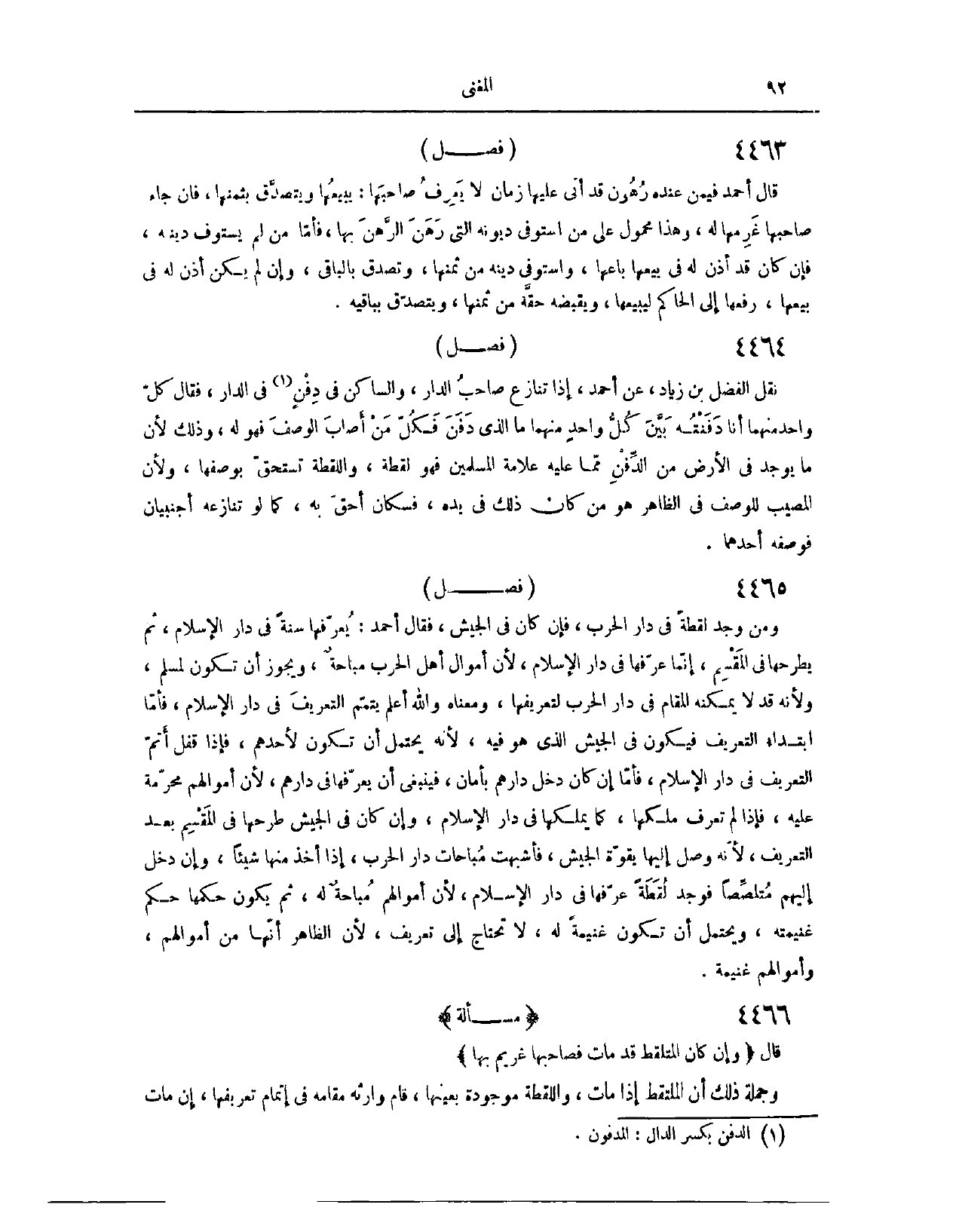 (٤٥٢٥) فَصْلٌ: وَمَنْ وَجَدَ لُقَطَةً فِي دَارِ الْحَرْبِ، فَإِنْ كَانَ فِي الْجَيْشِ، فَقَالَ أَحْمَدُ: يُعَرِّفُهَا سَنَةً فِي دَارِ الْإِسْلَامِ، ثُمَّ يَطْرَحُهَا فِي الْمَقْسِمِ. إنَّمَا عَرَّفَهَا فِي دَارِ الْإِسْلَامِ؛ لِأَنَّ أَمْوَالَ أَهْلِ الْحَرْبِ مُبَاحَةٌ، وَيَجُوزُ أَنْ تَكُونَ لِمُسْلِمٍ، وَلِأَنَّهُ قَدْ لَا يُمْكِنُهُ الْمُقَامُ فِي دَارِ الْحَرْبِ لِتَعْرِيفِهَا. وَمَعْنَاهُ - وَاَللَّهُ أَعْلَمُ - يُتَمِّمُ التَّعْرِيفَ فِي دَارِ الْإِسْلَامِ، فَأَمَّا ابْتِدَاءُ التَّعْرِيفِ فَيَكُونُ فِي الْجَيْشِ الَّذِي هُوَ فِيهِ؛ لِأَنَّهُ يَحْتَمِلُ أَنْ تَكُونَ لِأَحَدِهِمْ، فَإِذَا قَفَلَ أَتَمَّ التَّعْرِيفَ فِي دَارِ الْإِسْلَامِ. فَأَمَّا إنْ كَانَ دَخَلَ دَارَهُمْ بِأَمَانٍ، فَيَنْبَغِي أَنْ يُعَرِّفَهَا فِي دَارِهِمْ؛ لِأَنَّ أَمْوَالَهُمْ مُحَرَّمَةٌ عَلَيْهِ، فَإِذَا لَمْ تُعْرَفْ، مَلَكَهَا كَمَا يَمْلِكُهَا فِي دَارِ الْإِسْلَامِ