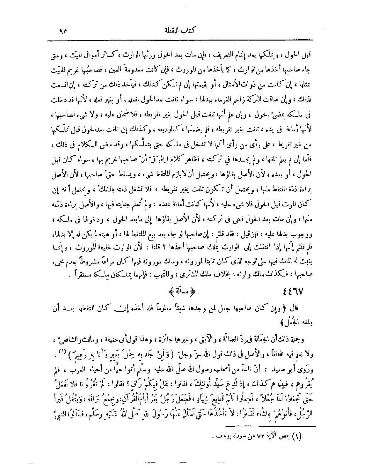 (٤٥٢٧) مَسْأَلَةٌ قَالَ: (وَإِنْ كَانَ صَاحِبُهَا جَعَلَ لِمَنْ وَجَدَهَا شَيْئًا مَعْلُومًا، فَلَهُ أَخْذُهُ إنْ كَانَ الْتَقَطَهَا بَعْدَ أَنْ بَلَغَهُ الْجُعْلُ) وَجُمْلَةُ ذَلِكَ أَنَّ الْجَعَالَةَ فِي رَدِّ الضَّالَّةِ وَالْآبِقِ وَغَيْرِهِمَا جَائِزَةٌ. وَهَذَا قَوْلُ أَبِي حَنِيفَةَ، وَمَالِكٍ وَالشَّافِعِيِّ. وَلَا نَعْلَمُ فِيهِ مُخَالِفًا. وَالْأَصْلُ فِي ذَلِكَ قَوْلُ اللَّهِ عَزَّ وَجَلَّ: {وَلِمَنْ جَاءَ بِهِ حِمْلُ بَعِيرٍ وَأَنَا بِهِ زَعِيمٌ} [يوسف: ٧٢] . وَرَوَى أَبُو سَعِيدٍ «أَنَّ نَاسًا مِنْ أَصْحَابِ رَسُولِ اللَّهِ - صَلَّى اللَّهُ عَلَيْهِ وَسَلَّمَ - أَتَوْا حَيًّا مِنْ أَحْيَاءِ الْعَرَبِ، فَلَمْ يُقْرُوهُمْ، فَبَيْنَمَا هُمْ كَذَلِكَ إذْ لُدِغَ سَيِّدُ أُولَئِكَ، فَقَالُوا: هَلْ فِيكُمْ رَاقٍ؟ فَقَالُوا: لَمْ تُقْرُونَا، فَلَا نَفْعَلُ حَتَّى تَجْعَلُوا لَنَا جُعْلًا فَجَعَلُوا لَهُمْ قَطِيعَ شِيَاهٍ، فَجَعَلَ رَجُلٌ يَقْرَأُ بِأُمِّ الْقُرْآنِ، وَيَجْمَعُ بُزَاقَهُ وَيَتْفُلُ، فَبَرَأَ الرَّجُلُ، فَأَتَوْهُمْ بِالشَّاءِ، فَقَالُوا: لَا نَأْخُذُهَا حَتَّى نَسْأَلَ عَنْهَا رَسُولَ اللَّهِ - صَلَّى اللَّهُ عَلَيْهِ وَسَلَّمَ -. فَسَأَلُوا النَّبِيَّ