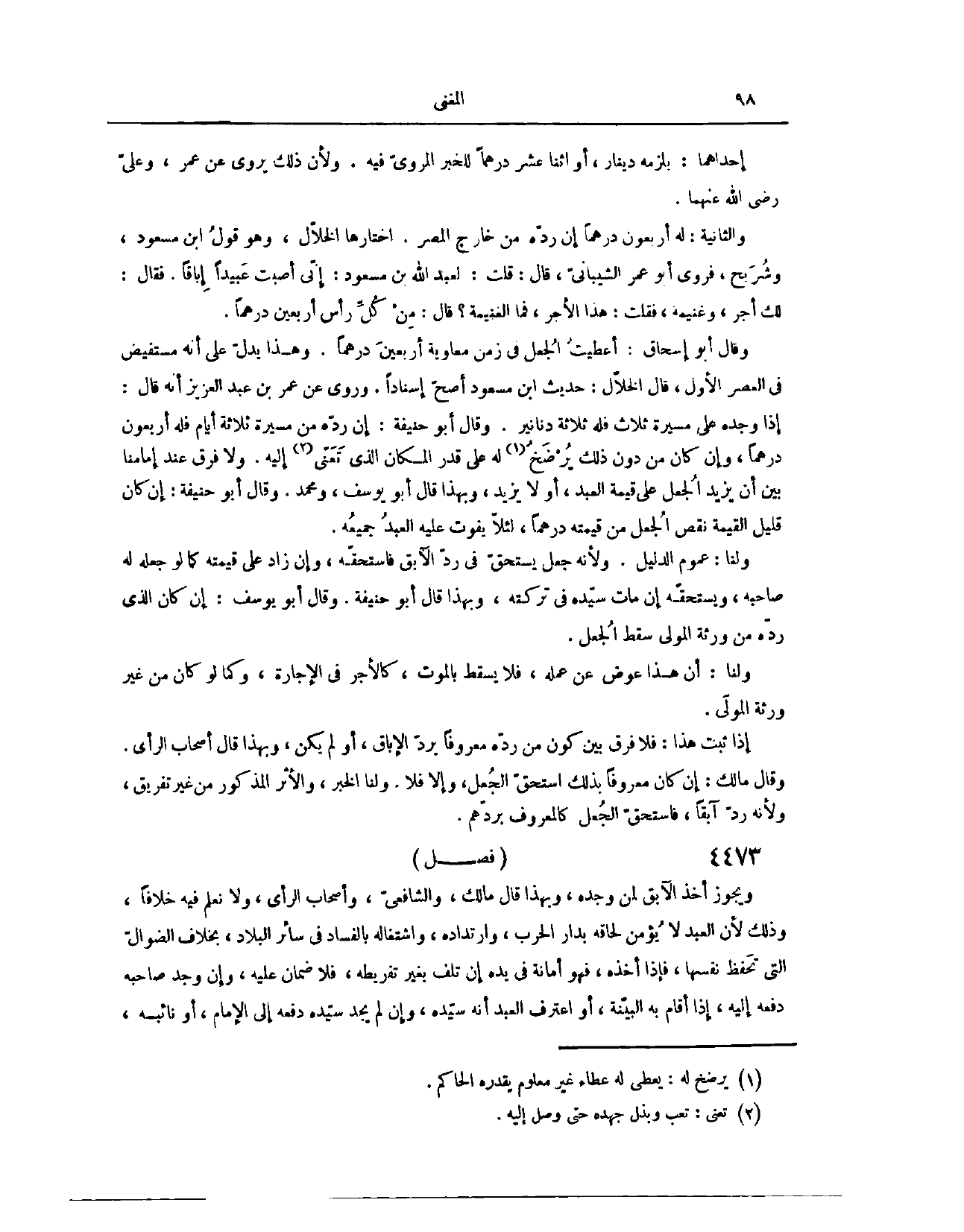 إحْدَاهُمَا يَلْزَمُهُ دِينَارٌ، أَوْ اثْنَا عَشَرَ دِرْهَمًا، لِلْخَبَرِ الْمَرْوِيِّ فِيهِ، وَلِأَنَّ ذَلِكَ يُرْوَى عَنْ عُمَرَ وَعَلِيٍّ - رَضِيَ اللَّهُ عَنْهُمَا -. وَالثَّانِيَةُ، لَهُ أَرْبَعُونَ دِرْهَمًا إنْ رَدَّهُ مِنْ خَارِجِ الْمِصْرِ اخْتَارَهَا الْخَلَّالُ، وَهُوَ قَوْلُ ابْنِ مَسْعُودٍ، وَشُرَيْحٍ. فَرَوَى أَبُو عَمْرٍو الشَّيْبَانِيُّ قَالَ: قُلْت لِعَبْدِ اللَّهِ بْنِ مَسْعُودٍ: إنِّي أَصَبْت عَبِيدًا إبَاقًا. فَقَالَ: لَك أَجْرٌ وَغَنِيمَةٌ. فَقُلْت: هَذَا الْأَجْرُ، فَمَا الْغَنِيمَةُ؟ قَالَ: مِنْ كُلِّ رَأْسٍ أَرْبَعِينَ دِرْهَمًا. وَقَالَ أَبُو إِسْحَاقَ: أَعْطَيْت الْجُعْلَ فِي زَمَنِ مُعَاوِيَةَ أَرْبَعِينَ دِرْهَمًا. وَهَذَا يَدُلُّ عَلَى أَنَّهُ مُسْتَفِيضٌ فِي الْعَصْرِ الْأَوَّلِ. قَالَ الْخَلَّالُ: حَدِيثُ ابْنِ مَسْعُودٍ أَصَحُّ إسْنَادًا.