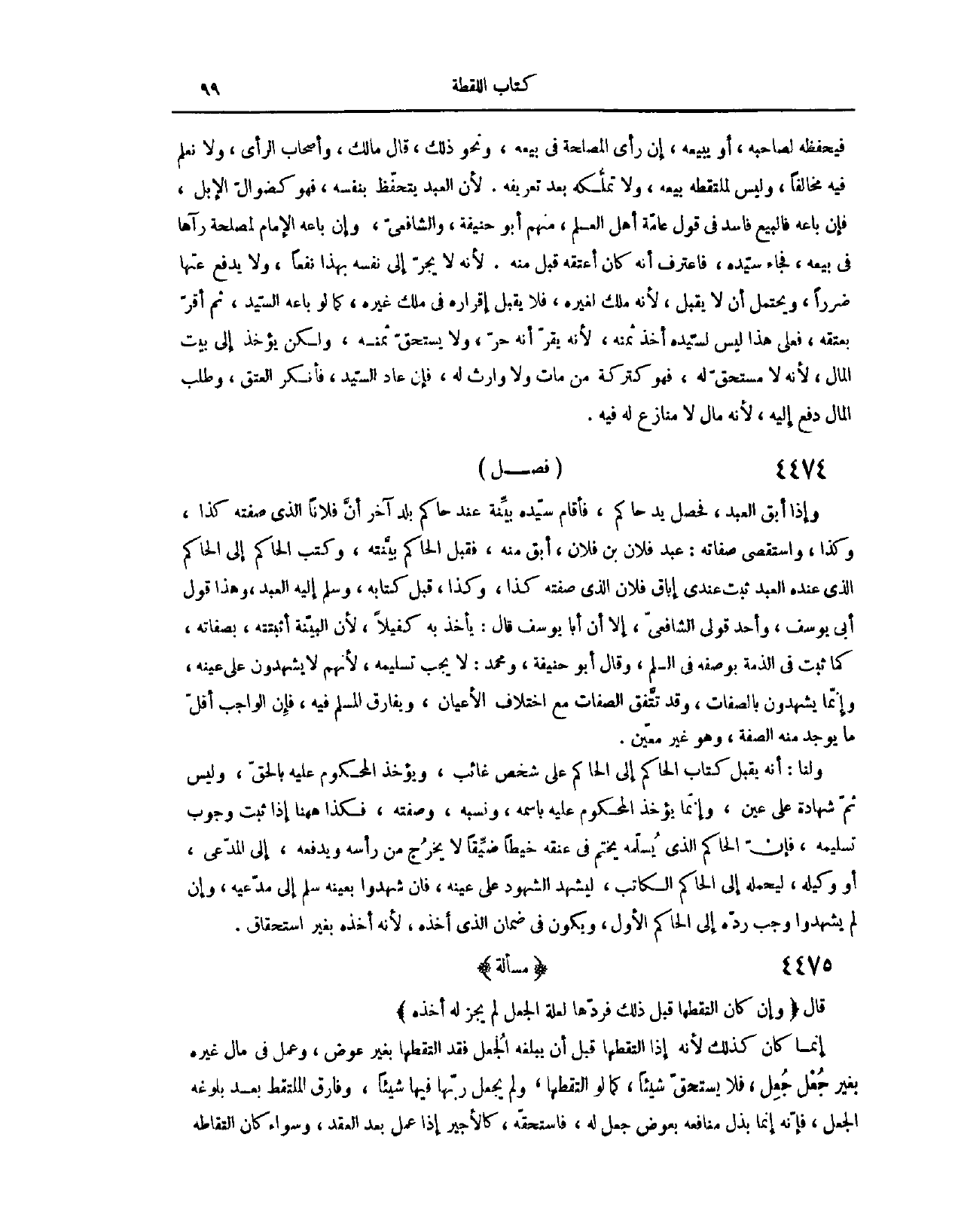 (٤٥٣٤) فَصْلٌ: وَإِذَا أَبَقَ الْعَبْدُ، فَحَصَلَ فِي يَدِ حَاكِمٍ، فَأَقَامَ سَيِّدُهُ بَيِّنَةً عِنْدَ حَاكِمِ بَلَدٍ آخَرَ أَنَّ فُلَانًا الَّذِي صِفَتُهُ كَذَا وَكَذَا، وَاسْتَقْصَى صِفَاتِهِ، عَبْدَ فُلَانِ بْنِ فُلَانٍ أَبَقَ مِنْهُ، فَقَبِلَ الْحَاكِمُ بَيِّنَتَهُ، وَكَتَبَ الْحَاكِمُ إلَى الْحَاكِمِ الَّذِي عِنْدَهُ الْعَبْدُ: ثَبَتَ عِنْدِي إبَاقُ فُلَانٍ الَّذِي صِفَتُهُ كَذَا وَكَذَا. قَبِلَ كِتَابَهُ، وَسَلَّمَ إلَيْهِ الْعَبْدَ. وَهَذَا قَوْلُ أَبِي يُوسُفَ، وَأَحَدُ قَوْلَيْ الشَّافِعِيِّ، إلَّا أَنَّ أَبَا يُوسُفَ قَالَ: يَأْخُذُ بِهِ كَفِيلًا؛ لِأَنَّ الْبَيِّنَةَ أَثْبَتَتْهُ بِصِفَاتِهِ، كَمَا ثَبَتَ فِي الذِّمَّةِ بِوَصْفِهِ فِي السَّلَمِ