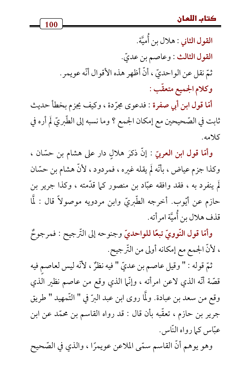 ثمّ قوله: " وقيل عاصم بن عديّ " فيه نظرٌ , لأنّه ليس لعاصمٍ فيه قصّة أنّه الذي لاعن امرأته، وإنّما الذي وقع من عاصم نظير الذي وقع من سعد بن عبادة. ولَمَّا روى ابن عبد البرّ في " التّمهيد " طريق جرير بن حازم , تعقّبه بأن قال: قد رواه القاسم بن محمّد عن ابن عبّاس كما رواه النّاس.