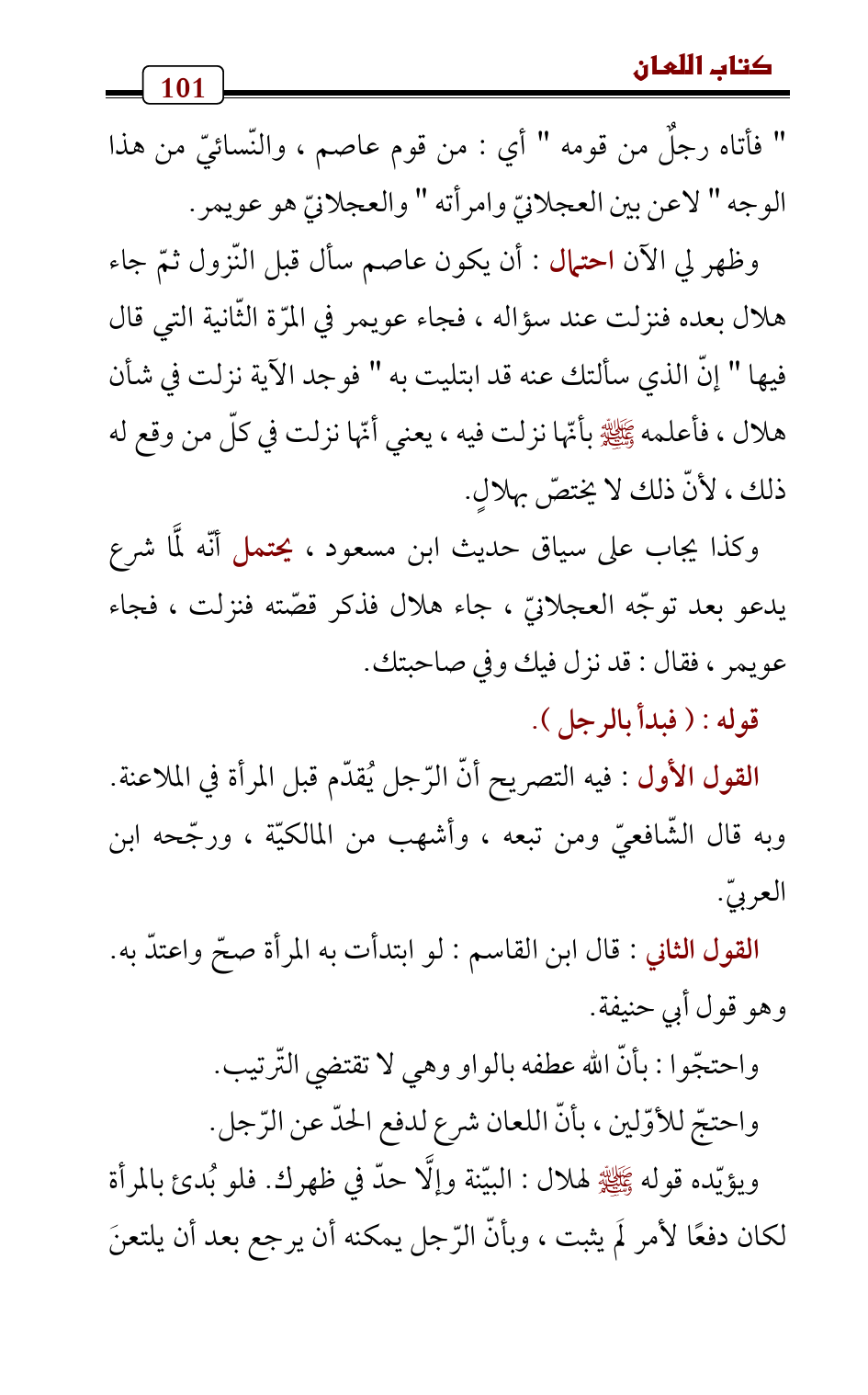 القول الأول: فيه التصريح أنّ الرّجل يُقدّم قبل المرأة في الملاعنة. وبه قال الشّافعيّ ومن تبعه , وأشهب من المالكيّة , ورجّحه ابن العربيّ.