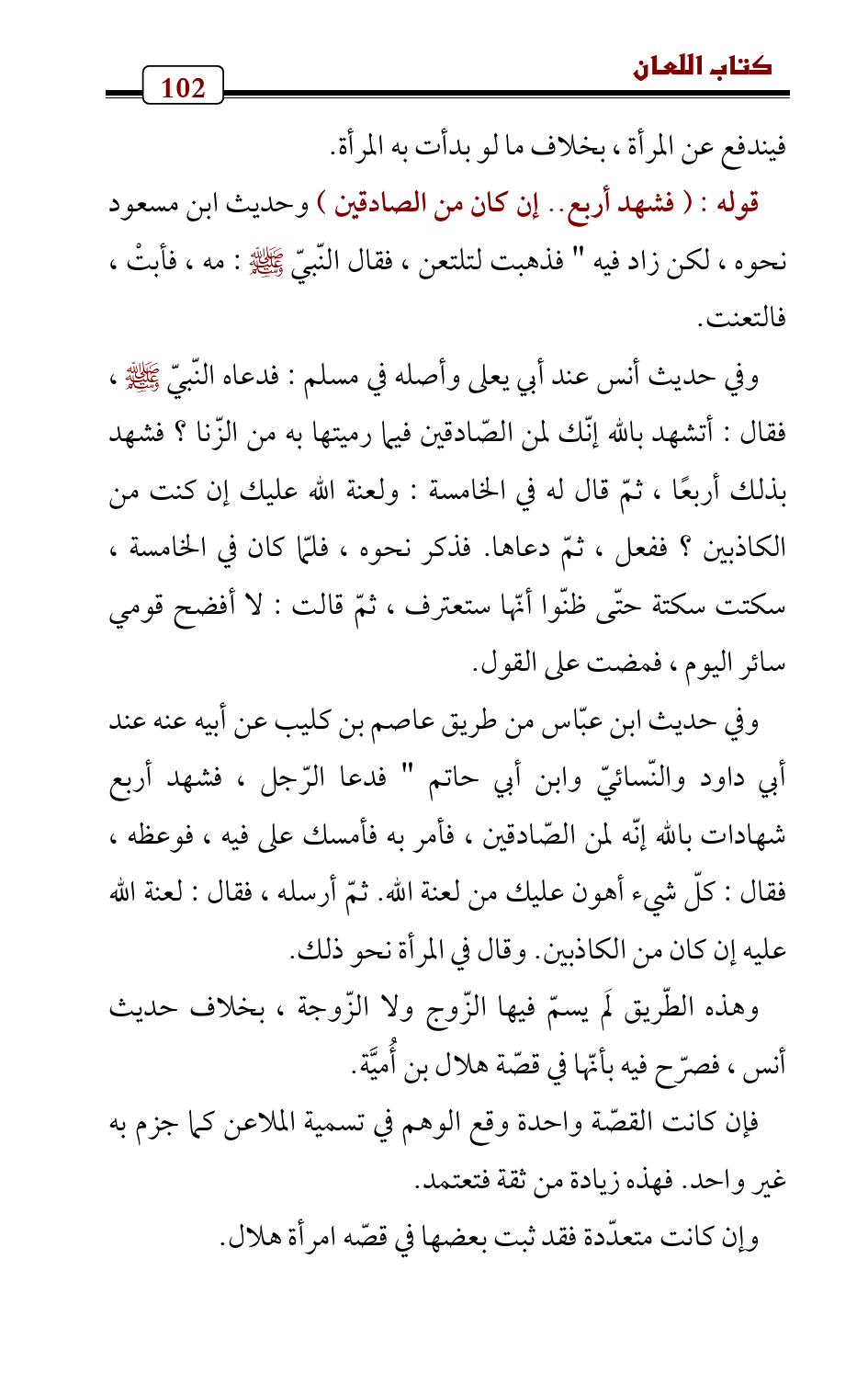 قوله: (فشهد أربع .. إن كان من الصادقين) وحديث ابن مسعود نحوه , لكن زاد فيه " فذهبت لتلتعن , فقال النّبيّ - صلى الله عليه وسلم -: مه، فأبتْ، فالتعنت.