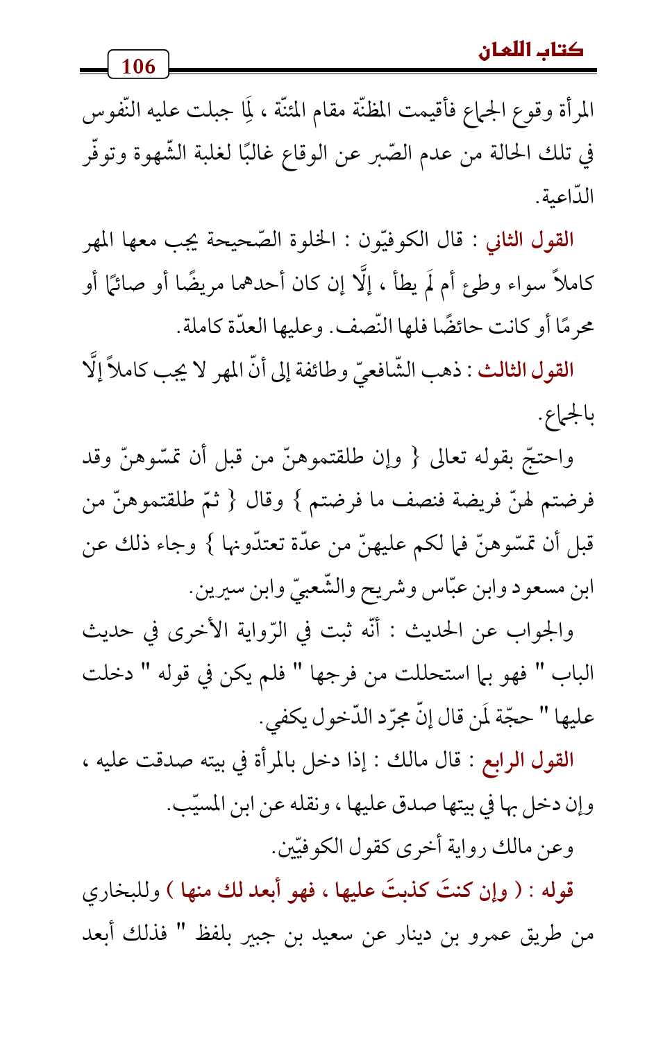 القول الثاني: قال الكوفيّون: الخلوة الصّحيحة يجب معها المهر كاملاً سواء وطئ أم لَم يطأ، إلَّا إن كان أحدهما مريضًا أو صائمًا أو محرمًا أو كانت حائضًا فلها النّصف. وعليها العدّة كاملة.