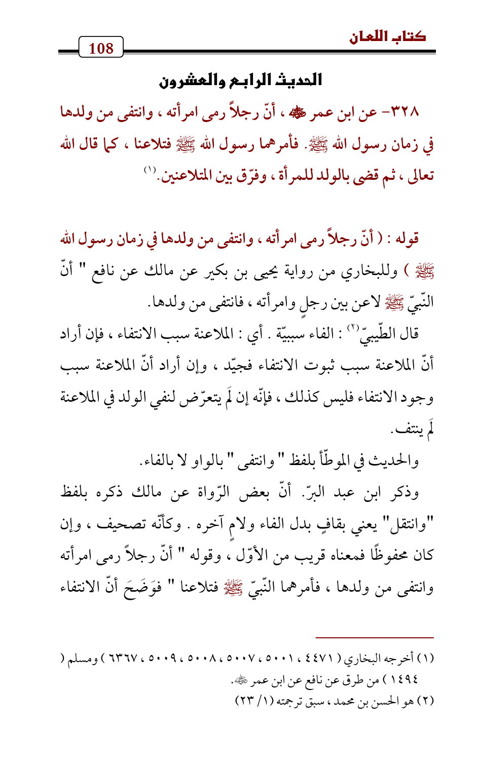 328 - عن ابن عمر - رضي الله عنه - , أنّ رجلاً رمى امرأته، وانتفى من ولدها في زمان رسول الله - صلى الله عليه وسلم -. فأمرهما رسول الله - صلى الله عليه وسلم - فتلاعنا، كما قال الله تعالى، ثم قضى بالولد للمرأة، وفرّق بين المتلاعنين. (¬1)