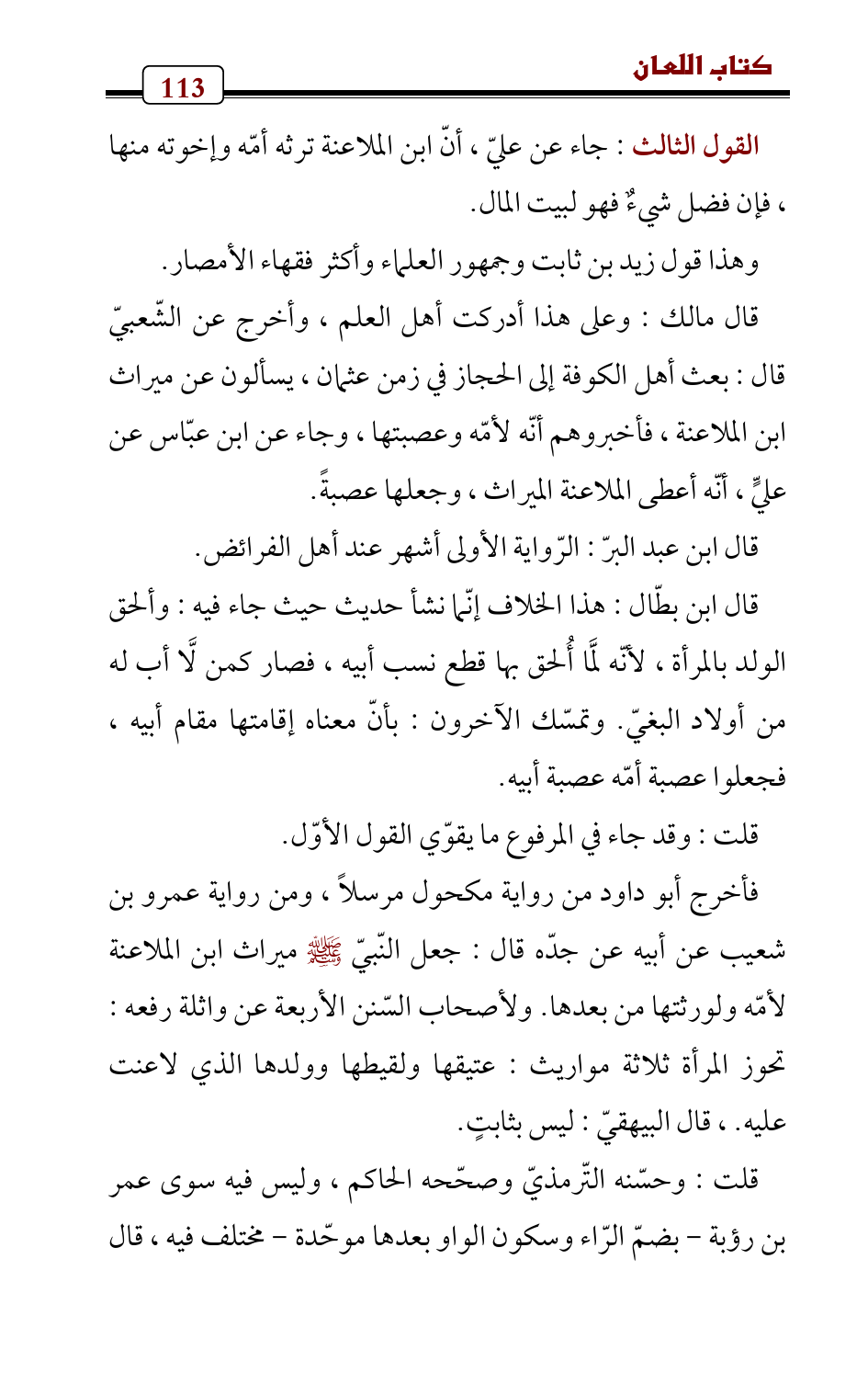 قال مالك: وعلى هذا أدركت أهل العلم، وأخرج عن الشّعبيّ قال: بعث أهل الكوفة إلى الحجاز في زمن عثمان , يسألون عن ميراث ابن الملاعنة , فأخبروهم أنّه لأمّه وعصبتها، وجاء عن ابن عبّاس عن عليٍّ , أنّه أعطى الملاعنة الميراث , وجعلها عصبةً.