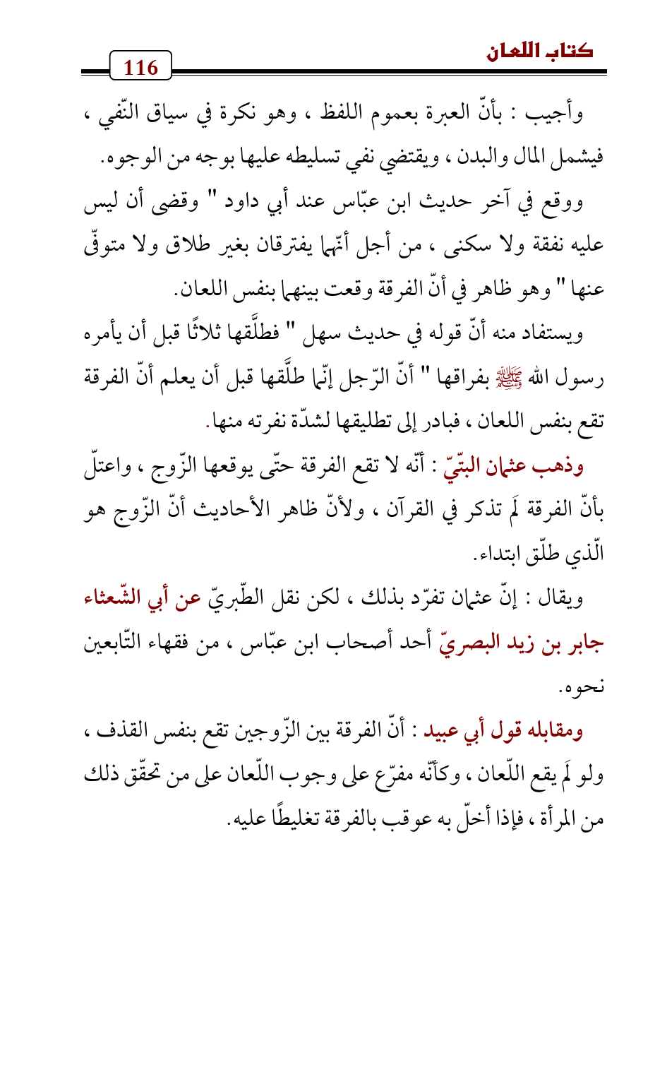 ووقع في آخر حديث ابن عبّاس عند أبي داود " وقضى أن ليس عليه نفقة ولا سكنى , من أجل أنّهما يفترقان بغير طلاق ولا متوفّى عنها " وهو ظاهر في أنّ الفرقة وقعت بينهما بنفس اللعان.