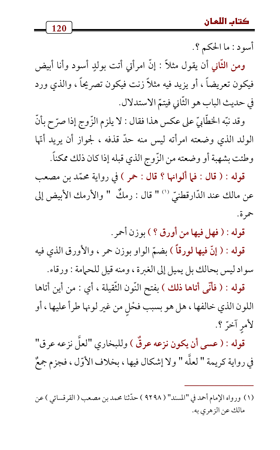 ومن الثّاني أن يقول مثلاً: إنّ امرأتي أتت بولدٍ أسود وأنا أبيض فيكون تعريضاً، أو يزيد فيه مثلاً زنت فيكون تصريحاً، والذي ورد في حديث الباب هو الثّاني فيتمّ الاستدلال.