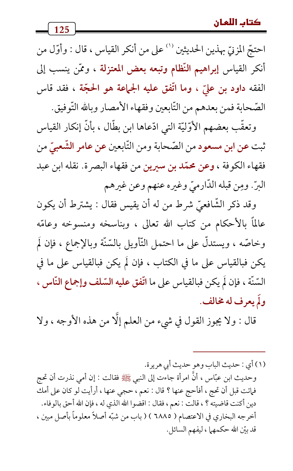 احتجّ المزنيّ بهذين الحديثين (¬1) على من أنكر القياس، قال: وأوّل من أنكر القياس إبراهيم النّظام وتبعه بعض المعتزلة، وممّن ينسب إلى الفقه داود بن عليّ، وما اتّفق عليه الجماعة هو الحجّة، فقد قاس الصّحابة فمن بعدهم من التّابعين وفقهاء الأمصار وبالله التّوفيق.
