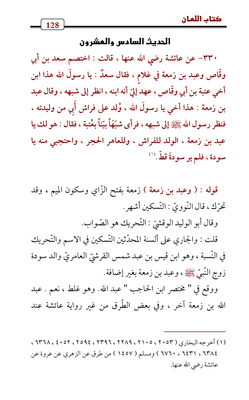 330 - عن عائشة رضي الله عنها، قالت: اختصم سعد بن أبي وقّاص وعبد بن زمعة في غلامٍ، فقال سعدٌ: يا رسولَ الله هذا ابن أخي عتبة بن أبي وقّاص، عهد إليّ أنه ابنه، انظر إلى شبهه، وقال عبد بن زمعة: هذا أخي يا رسولَ الله، وُلد على فراش أَبِي من وليدته، فنظر رسول الله - صلى الله عليه وسلم - إلى شبهه، فرأى شبَهَاً بيّناً بعُتبة، فقال: هو لك يا عبد بن زمعة، الولد للفراش، وللعاهر الحجر، واحتجبي منه يا سودة، فلم ير سودةَ قطّ. (¬1)