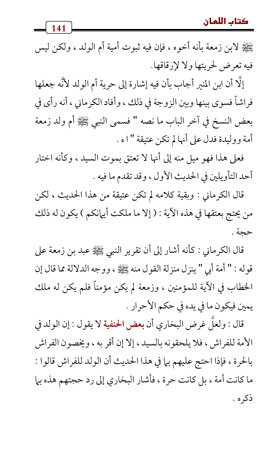 إلَّا أن ابن المنير أجاب بأن فيه إشارة إلى حرية أم الولد لأنَّه جعلها فراشاً فسوى بينها وبين الزوجة في ذلك، وأفاد الكرماني , أنه رأى في بعض النسخ في آخر الباب ما نصه " فسمى النبي - صلى الله عليه وسلم - أم ولد زمعة أمة ووليدة فدل على أنها لم تكن عتيقة " اهـ.