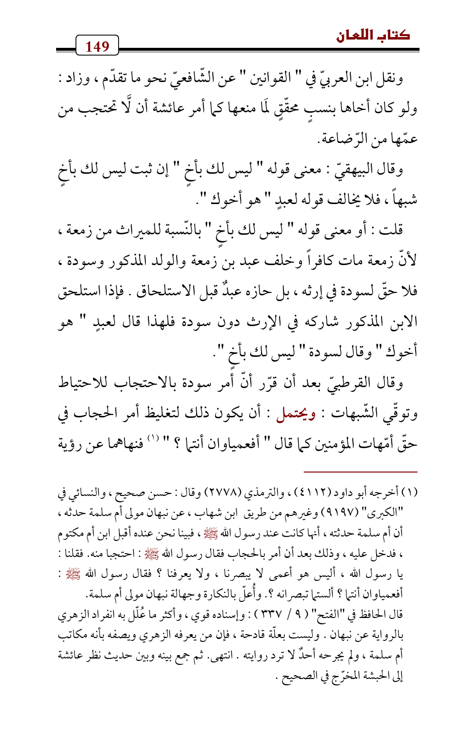 قلت: أو معنى قوله " ليس لك بأخٍ " بالنّسبة للميراث من زمعة , لأنّ زمعة مات كافراً وخلف عبد بن زمعة والولد المذكور وسودة , فلا حقّ لسودة في إرثه , بل حازه عبدٌ قبل الاستلحاق. فإذا استلحق الابن المذكور شاركه في الإرث دون سودة فلهذا قال لعبدٍ " هو أخوك " وقال لسودة " ليس لك بأخٍ ".