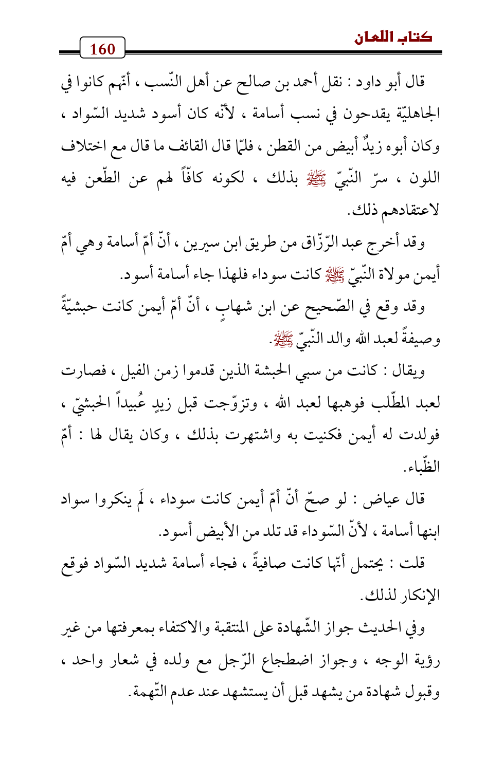 وقد أخرج عبد الرّزّاق من طريق ابن سيرين، أنّ أمّ أسامة وهي أمّ أيمن مولاة النّبيّ - صلى الله عليه وسلم - كانت سوداء فلهذا جاء أسامة أسود.