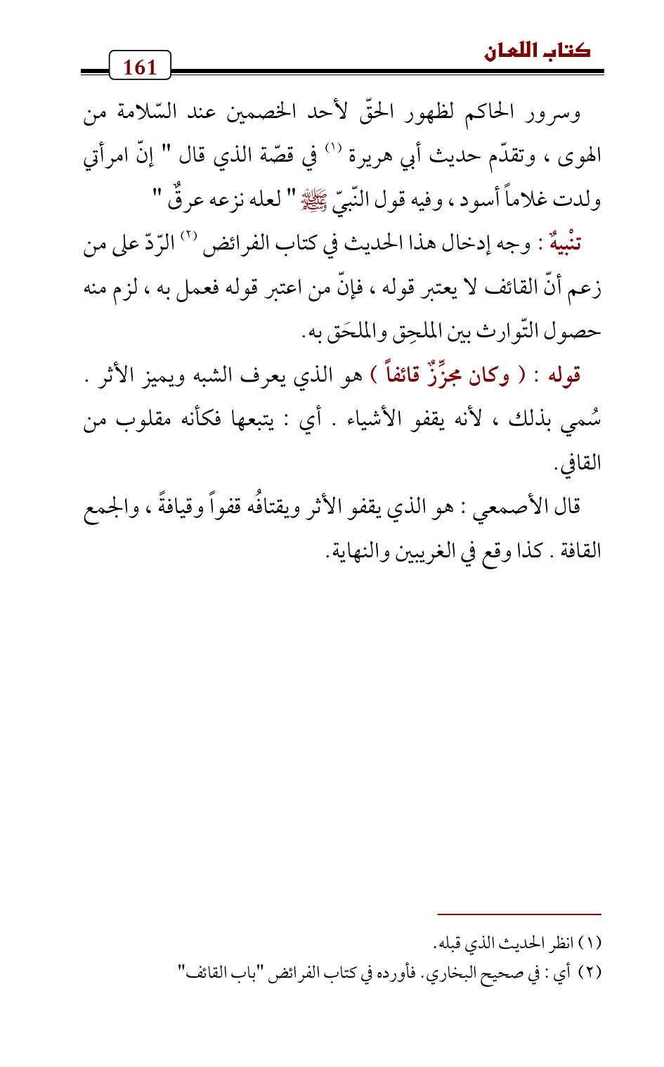 تنْبيهٌ: وجه إدخال هذا الحديث في كتاب الفرائض (¬2) الرّدّ على من زعم أنّ القائف لا يعتبر قوله، فإنّ من اعتبر قوله فعمل به , لزم منه حصول التّوارث بين الملحِق والملحَق به.