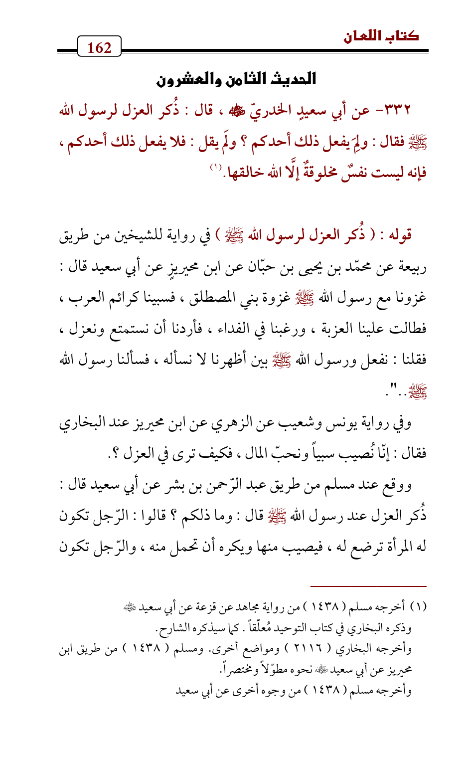 332 - عن أبي سعيدٍ الخدريّ - رضي الله عنه - , قال: ذُكر العزل لرسول الله - صلى الله عليه وسلم - فقال: ولِمَ يفعل ذلك أحدكم؟ ولَم يقل: فلا يفعل ذلك أحدكم , فإنه ليست نفسٌ مخلوقةٌ إلَّا الله خالقها. (¬1)