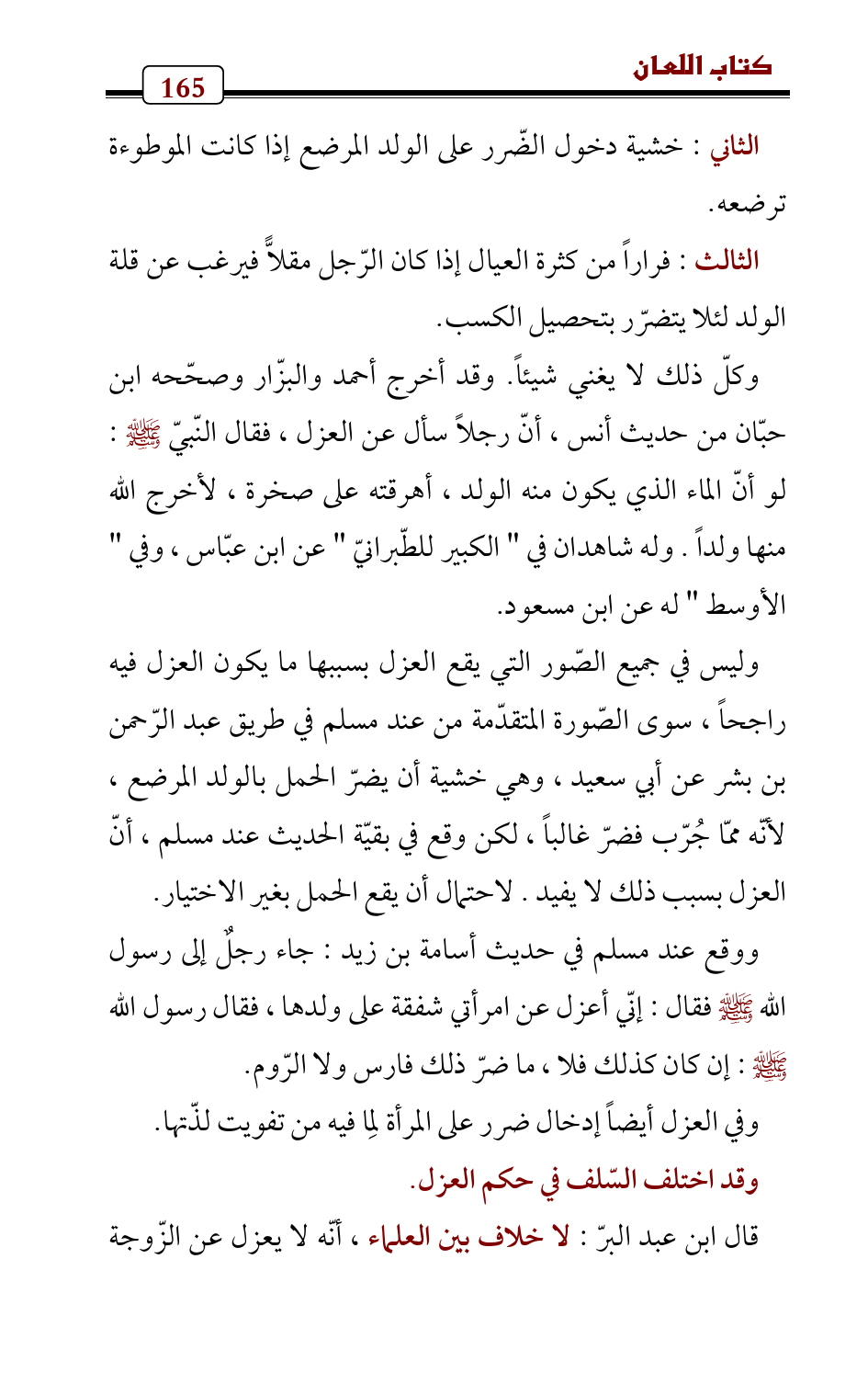 وليس في جميع الصّور التي يقع العزل بسببها ما يكون العزل فيه راجحاً , سوى الصّورة المتقدّمة من عند مسلم في طريق عبد الرّحمن بن بشر عن أبي سعيد , وهي خشية أن يضرّ الحمل بالولد المرضع , لأنّه ممّا جُرّب فضرّ غالباً، لكن وقع في بقيّة الحديث عند مسلم , أنّ العزل بسبب ذلك لا يفيد. لاحتمال أن يقع الحمل بغير الاختيار.