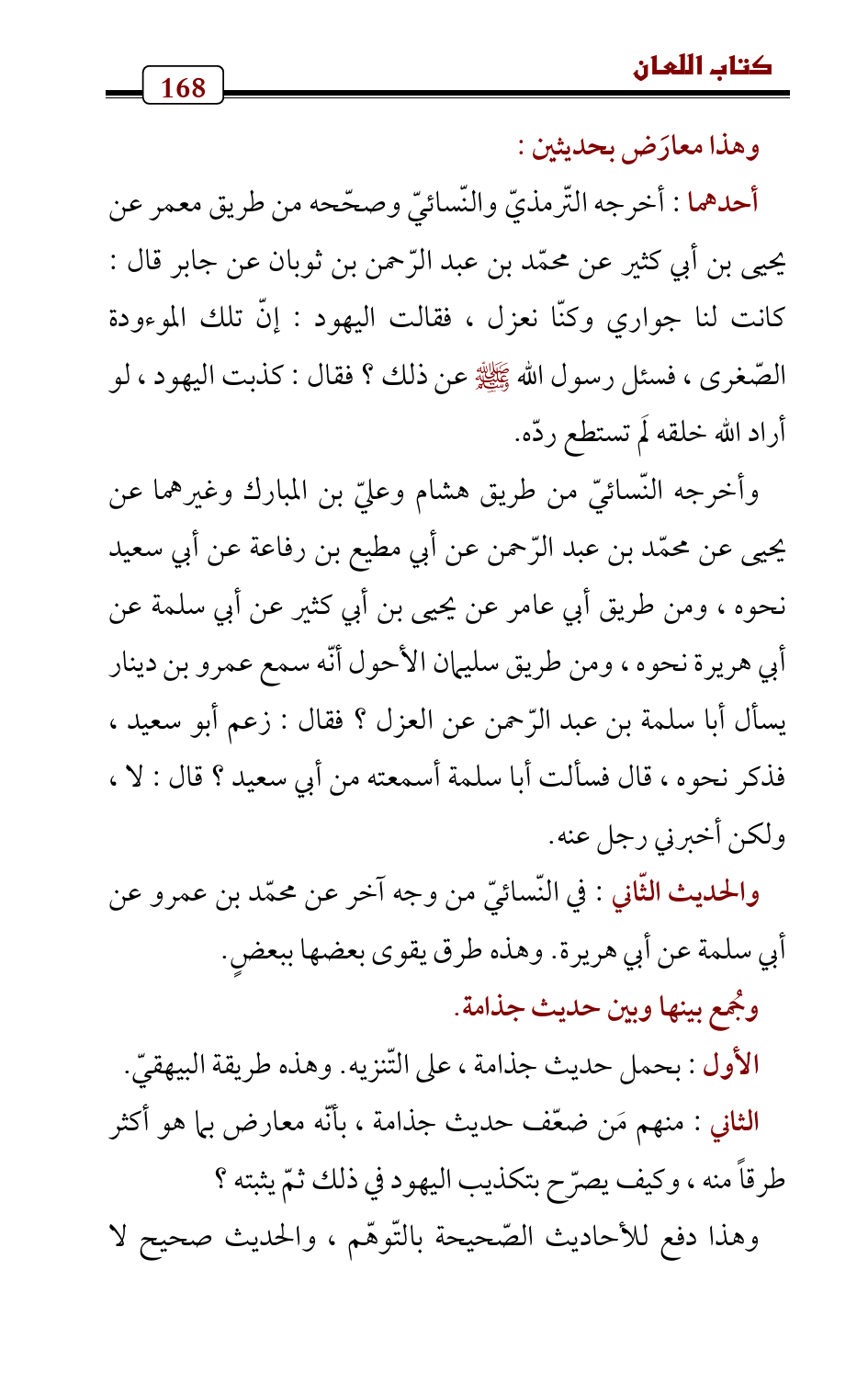 أحدهما: أخرجه التّرمذيّ والنّسائيّ وصحّحه من طريق معمر عن يحيى بن أبي كثير عن محمّد بن عبد الرّحمن بن ثوبان عن جابر قال: كانت لنا جواري وكنّا نعزل، فقالت اليهود: إنّ تلك الموءودة الصّغرى، فسئل رسول الله - صلى الله عليه وسلم - عن ذلك؟ فقال: كذبت اليهود، لو أراد الله خلقه لَم تستطع ردّه.