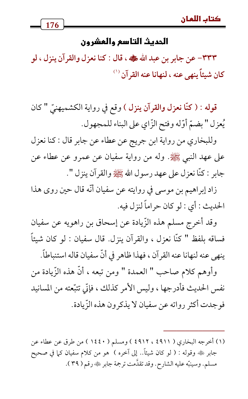 333 - عن جابر بن عبد الله - رضي الله عنه - , قال: كنا نعزل والقرآن ينزل، لو كان شيئاً ينهى عنه، لنهانا عنه القرآن (¬1)