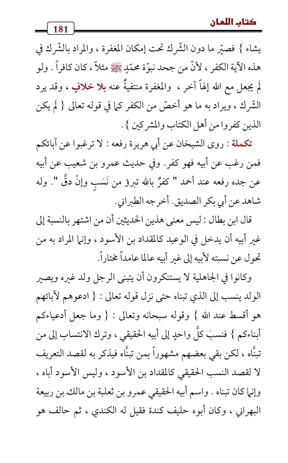 تكملة: روى الشيخان عن أبي هريرة رفعه: لا ترغبوا عن آبائكم فمن رغب عن أبيه فهو كفر. وفي حديث عمرو بن شعيب عن أبيه عن جده رفعه عند أحمد " كفرٌ بالله تبرؤ من نَسَبٍ وإنْ دقَّ ". وله شاهد عن أبي بكر الصديق. أخرجه الطبراني.