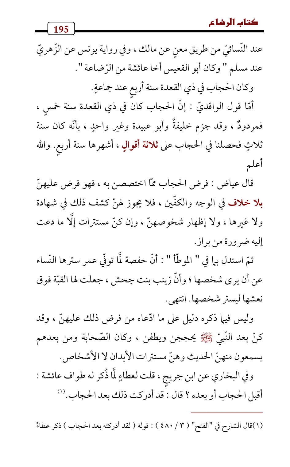 أمّا قول الواقديّ: إنّ الحجاب كان في ذي القعدة سنة خمسٍ , فمردودٌ , وقد جزم خليفةٌ وأبو عبيدة وغير واحدٍ , بأنّه كان سنة ثلاثٍ فحصلنا في الحجاب على ثلاثة أقوالٍ , أشهرها سنة أربعٍ. والله أعلم