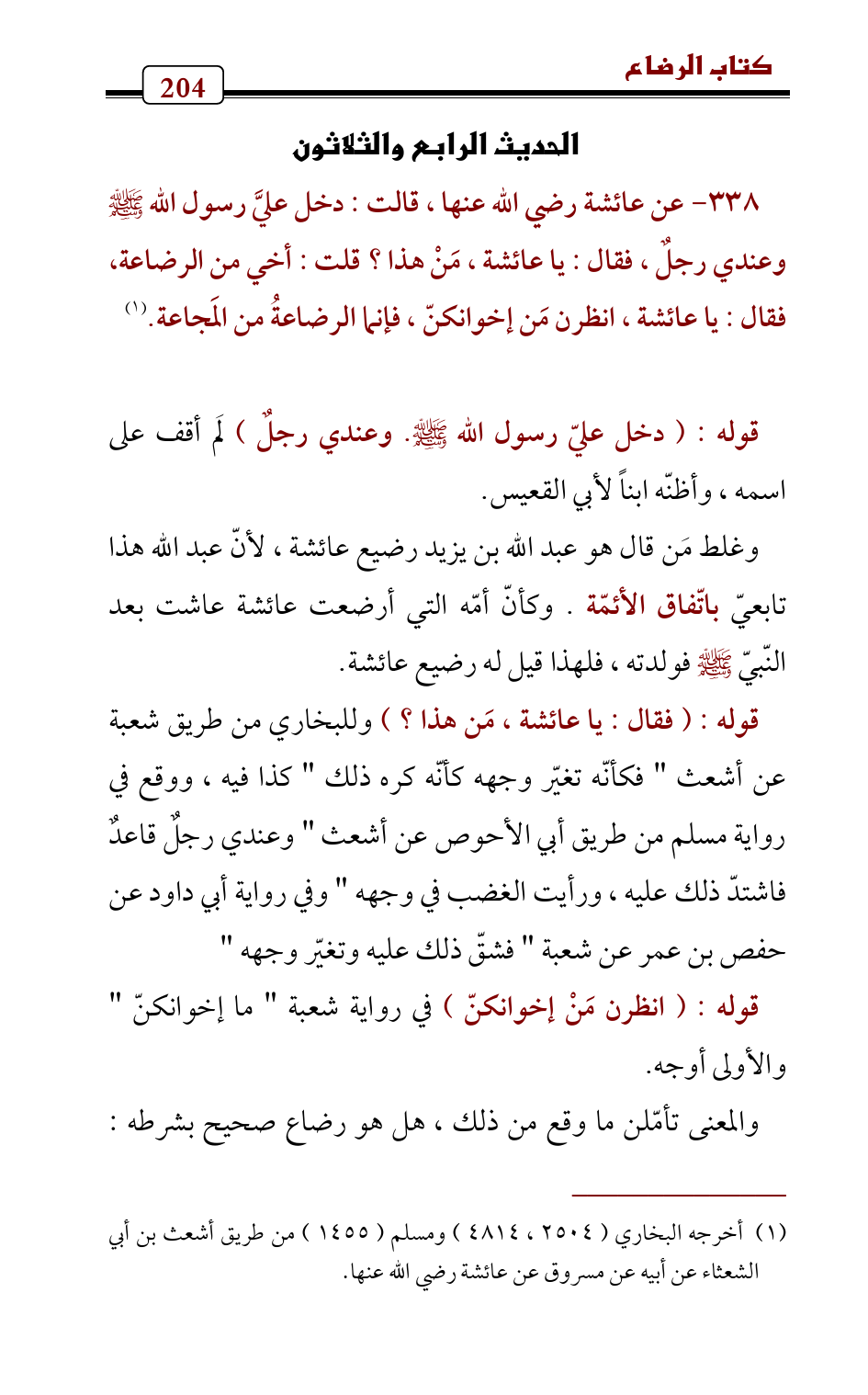 338 - عن عائشة رضي الله عنها، قالت: دخل عليَّ رسول الله - صلى الله عليه وسلم - وعندي رجلٌ، فقال: يا عائشة، مَنْ هذا؟ قلت: أخي من الرضاعة، فقال: يا عائشة، انظرن مَن إخوانكنّ، فإنما الرضاعةُ من المَجاعة. (¬1)