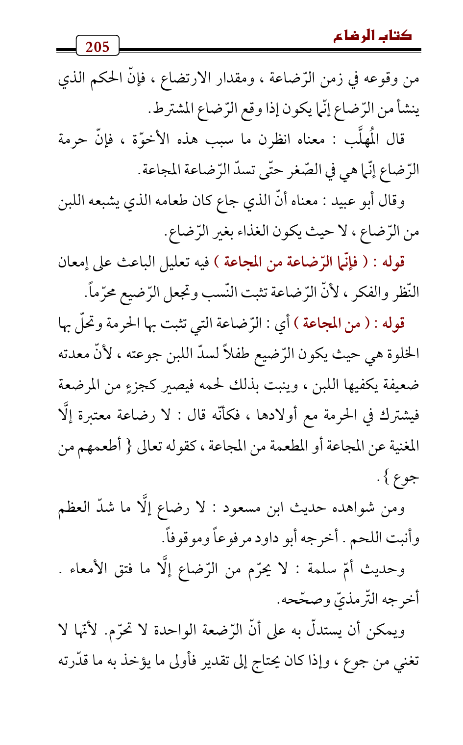 قوله: (من المجاعة) أي: الرّضاعة التي تثبت بها الحرمة وتحلّ بها الخلوة هي حيث يكون الرّضيع طفلاً لسدّ اللبن جوعته، لأنّ معدته ضعيفة يكفيها اللبن , وينبت بذلك لحمه فيصير كجزءٍ من المرضعة فيشترك في الحرمة مع أولادها، فكأنّه قال: لا رضاعة معتبرة إلَّا المغنية عن المجاعة أو المطعمة من المجاعة، كقوله تعالى {أطعمهم من جوع}.