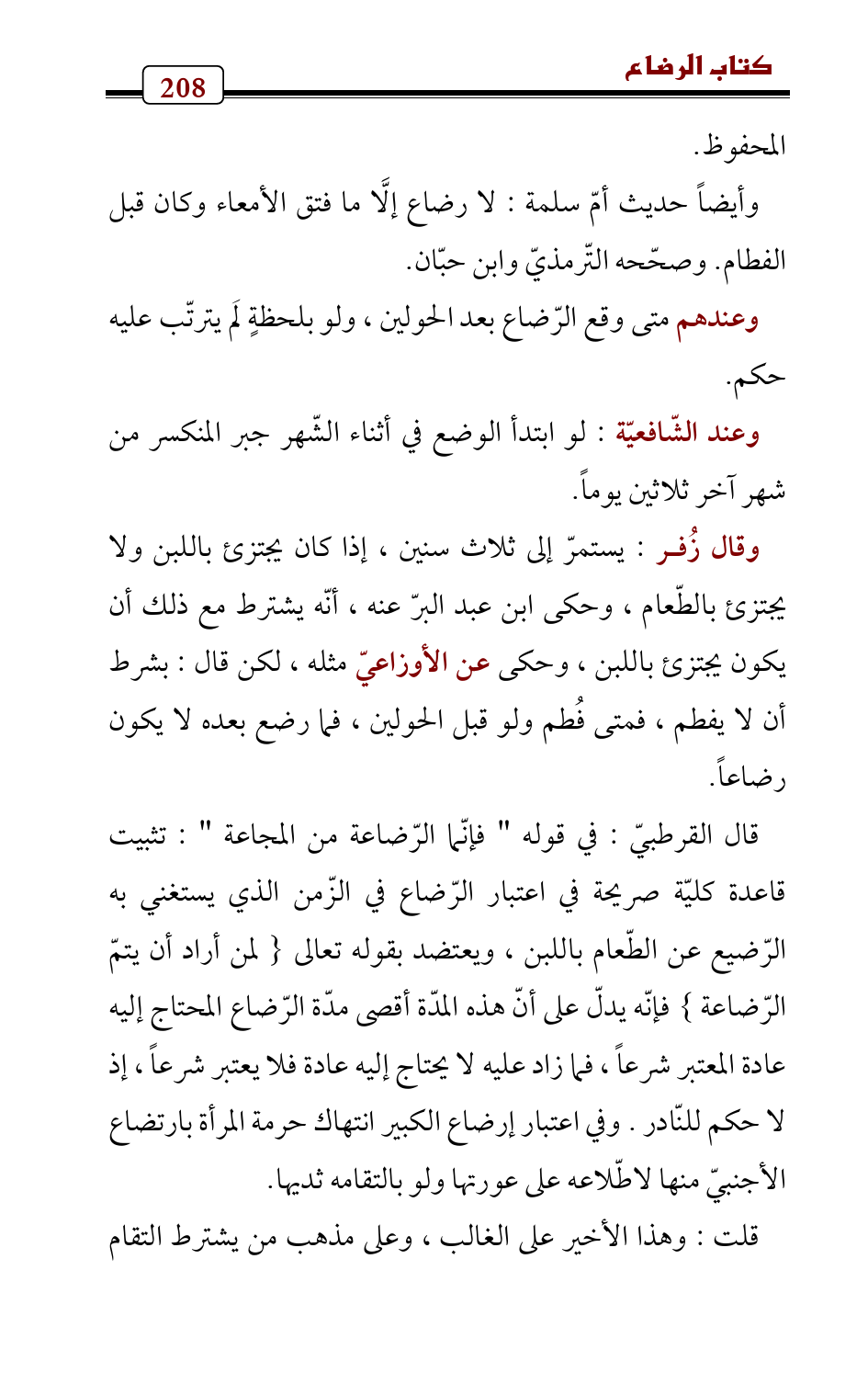 وقال زُفر: يستمرّ إلى ثلاث سنين , إذا كان يجتزئ باللبن ولا يجتزئ بالطّعام، وحكى ابن عبد البرّ عنه , أنّه يشترط مع ذلك أن يكون يجتزئ باللبن، وحكى عن الأوزاعيّ مثله , لكن قال: بشرط أن لا يفطم، فمتى فُطم ولو قبل الحولين , فما رضع بعده لا يكون رضاعاً.