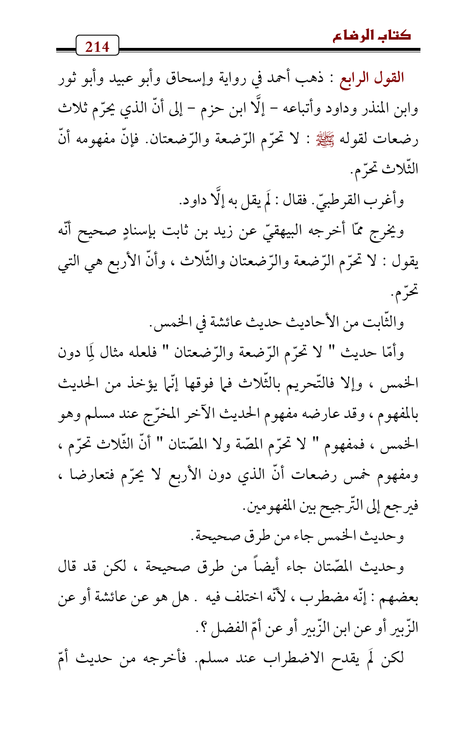 القول الرابع: ذهب أحمد في رواية وإسحاق وأبو عبيد وأبو ثور وابن المنذر وداود وأتباعه - إلَّا ابن حزم - إلى أنّ الذي يحرّم ثلاث رضعات لقوله - صلى الله عليه وسلم -: لا تحرّم الرّضعة والرّضعتان. فإنّ مفهومه أنّ الثّلاث تحرّم.