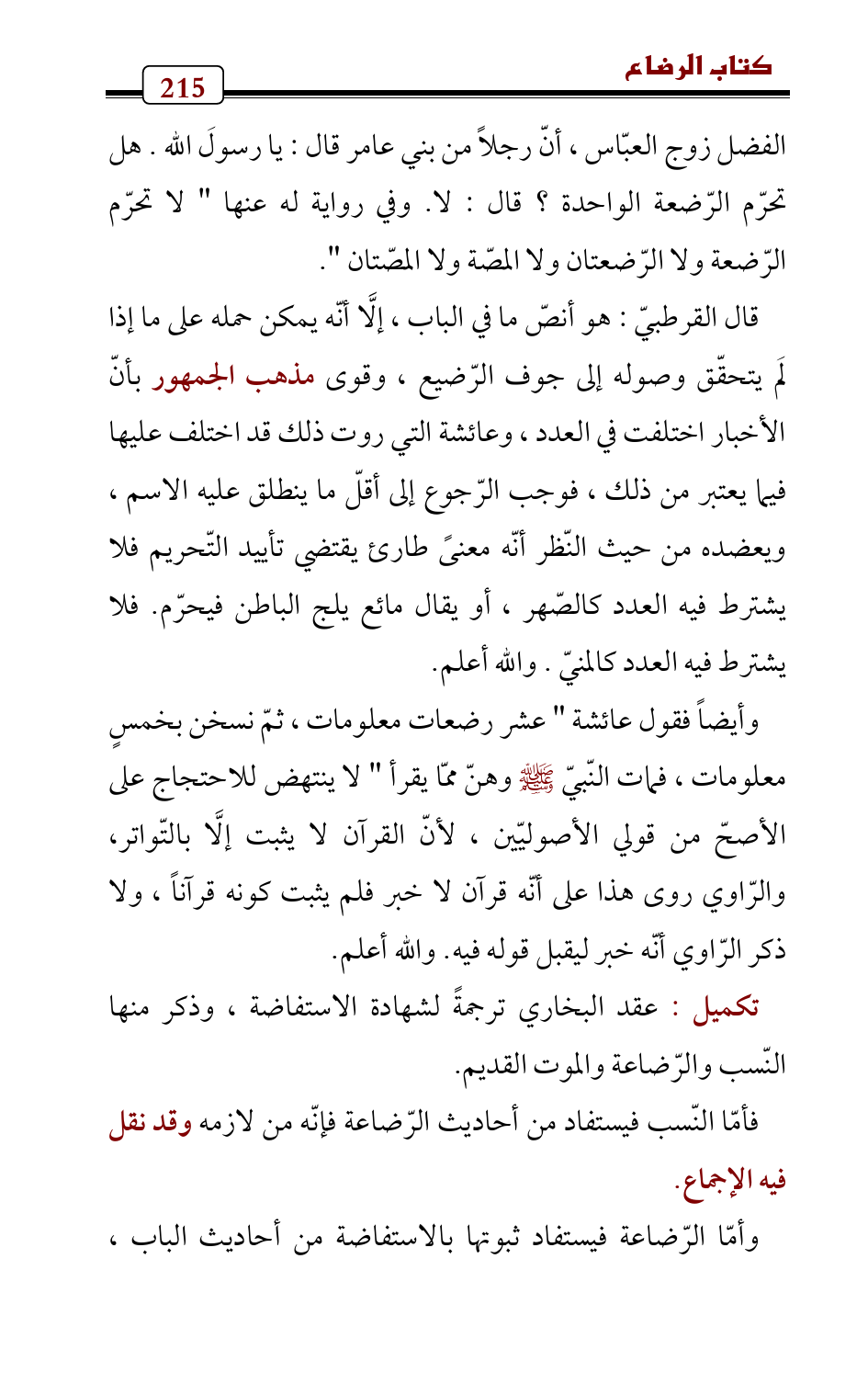 الفضل زوج العبّاس , أنّ رجلاً من بني عامر قال: يا رسولَ الله. هل تحرّم الرّضعة الواحدة؟ قال: لا. وفي رواية له عنها " لا تحرّم الرّضعة ولا الرّضعتان ولا المصّة ولا المصّتان ".
