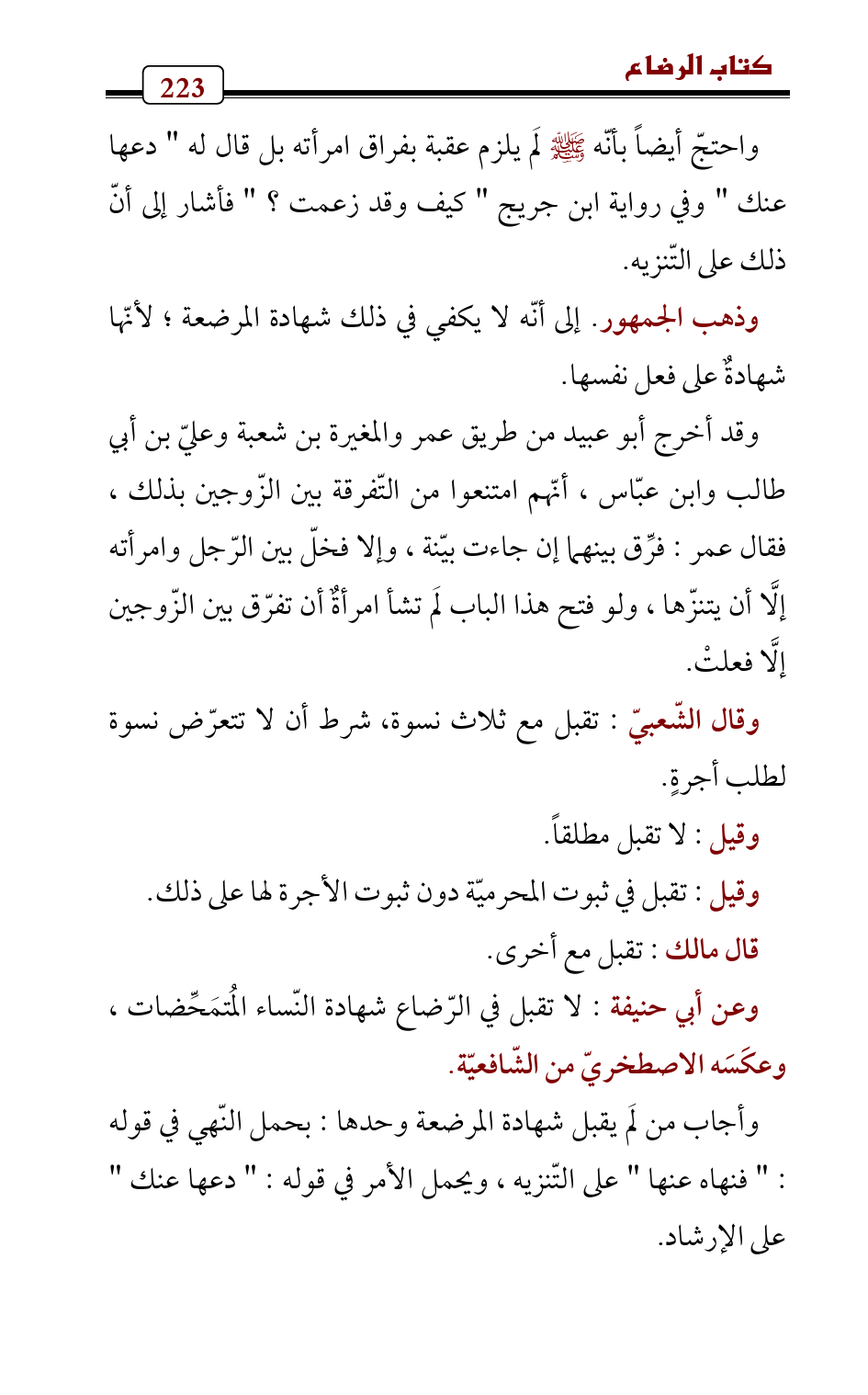 وذهب الجمهور. إلى أنّه لا يكفي في ذلك شهادة المرضعة؛ لأنّها شهادةٌ على فعل نفسها.