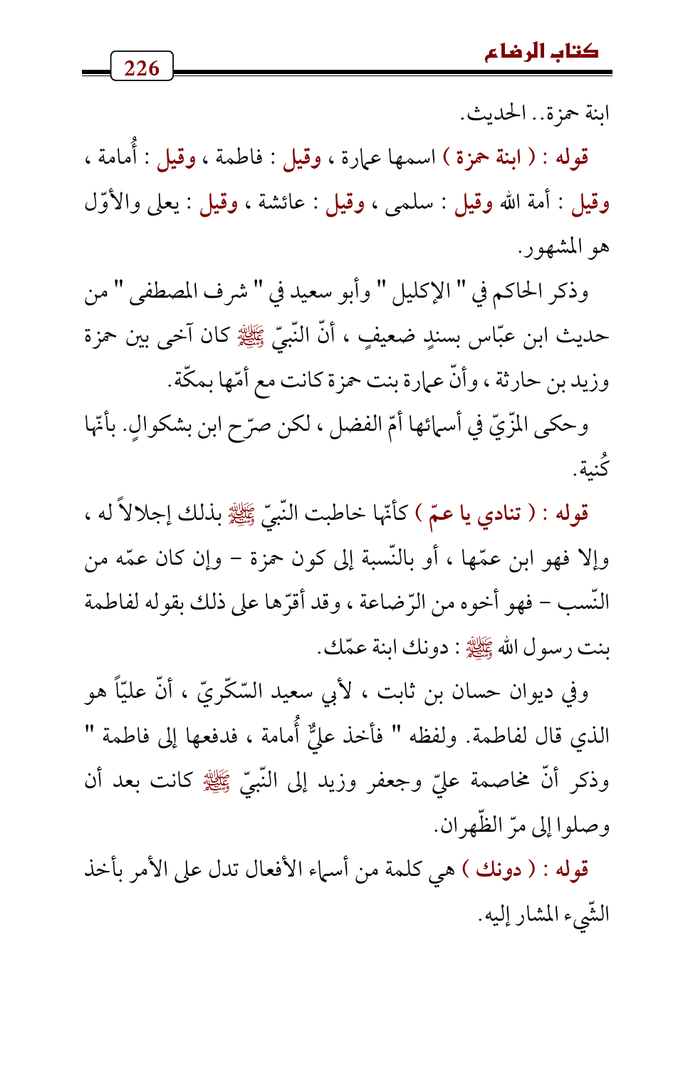 قوله: (ابنة حمزة) اسمها عمارة , وقيل: فاطمة , وقيل: أُمامة , وقيل: أمة الله وقيل: سلمى، وقيل: عائشة , وقيل: يعلى والأوّل هو المشهور.