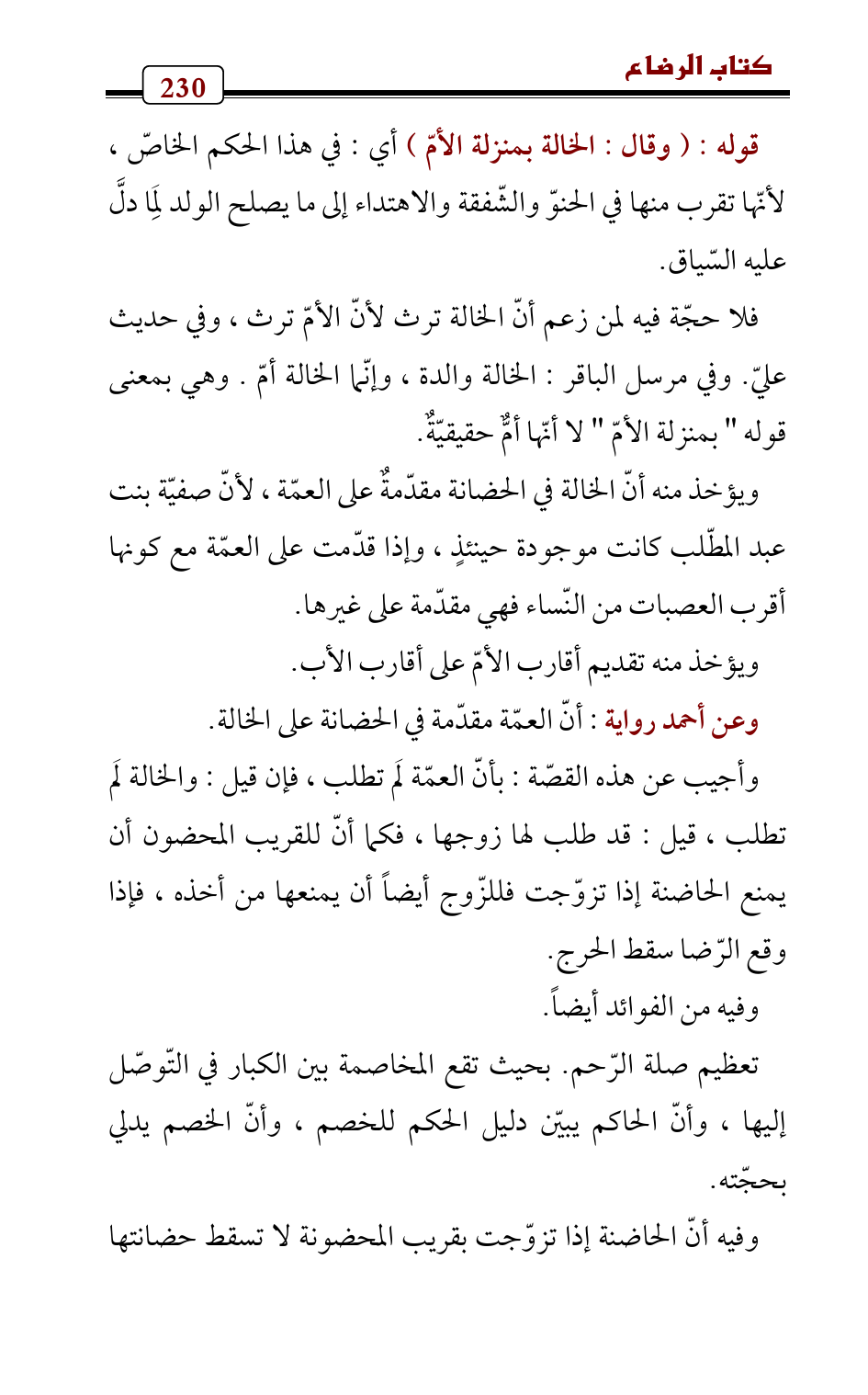 ويؤخذ منه أنّ الخالة في الحضانة مقدّمةٌ على العمّة , لأنّ صفيّة بنت عبد المطّلب كانت موجودة حينئذٍ، وإذا قدّمت على العمّة مع كونها أقرب العصبات من النّساء فهي مقدّمة على غيرها.