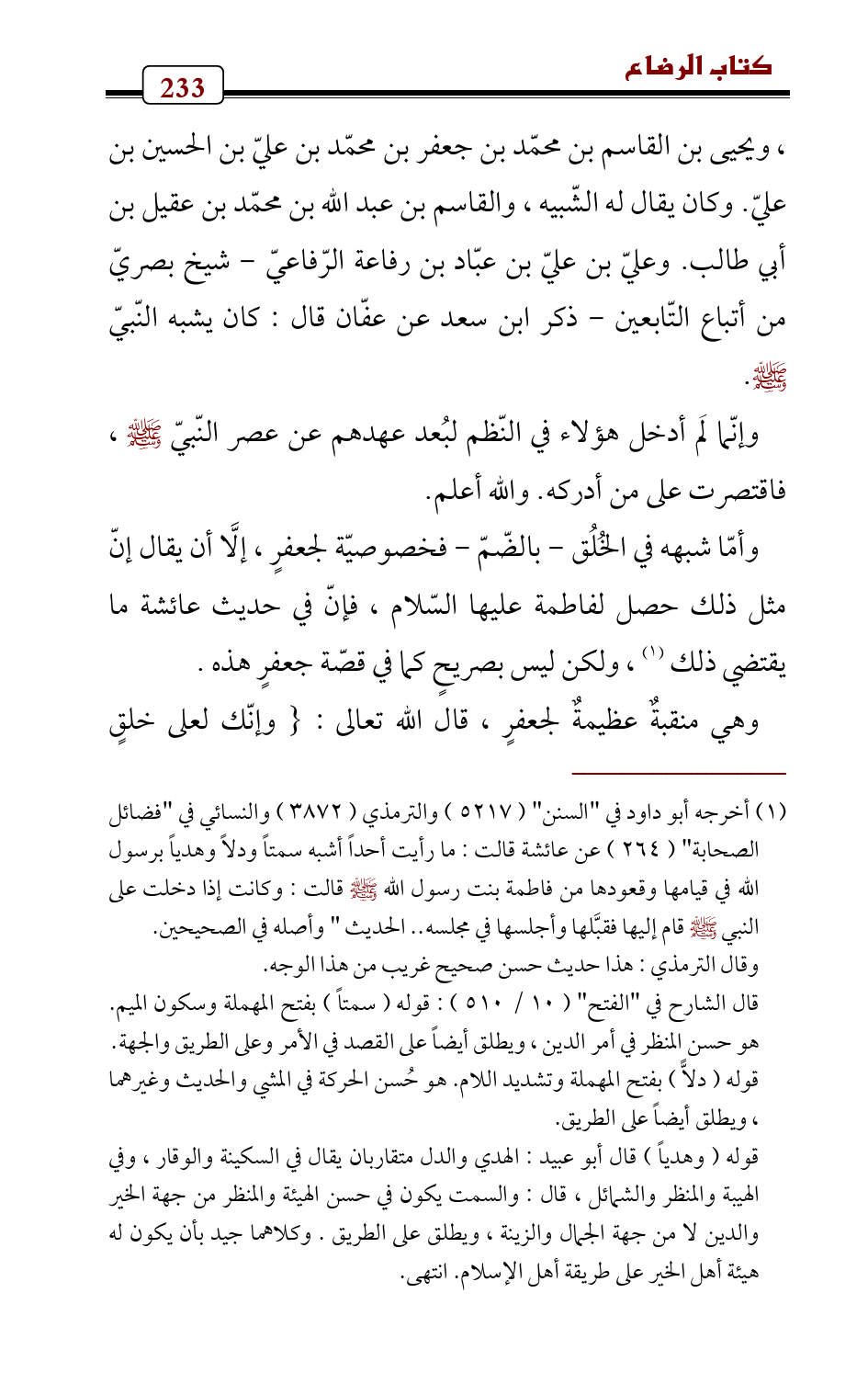 ويحيى بن القاسم بن محمّد بن جعفر بن محمّد بن عليّ بن الحسين بن عليّ. وكان يقال له الشّبيه، والقاسم بن عبد الله بن محمّد بن عقيل بن أبي طالب. وعليّ بن عليّ بن عبّاد بن رفاعة الرّفاعيّ - شيخ بصريّ من أتباع التّابعين - ذكر ابن سعد عن عفّان قال: كان يشبه النّبيّ - صلى الله عليه وسلم -.