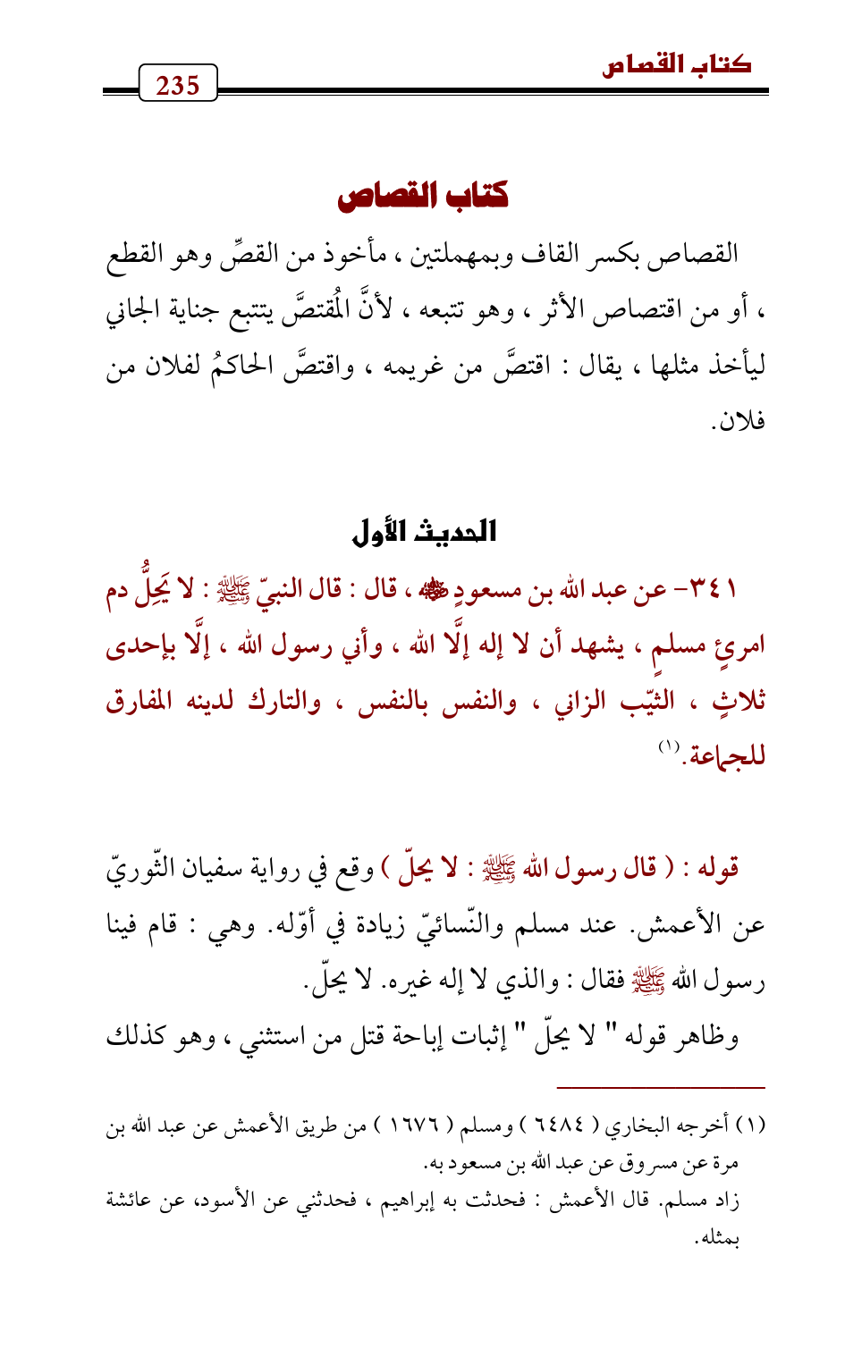 341 - عن عبد الله بن مسعودٍ - رضي الله عنه - , قال: قال النبيّ - صلى الله عليه وسلم -: لا يَحِلُّ دم امرئٍ مسلمٍ، يشهد أن لا إله إلَّا الله، وأني رسول الله، إلَّا بإحدى ثلاثٍ، الثيّب الزاني، والنفس بالنفس، والتارك لدينه المفارق للجماعة. (¬1)