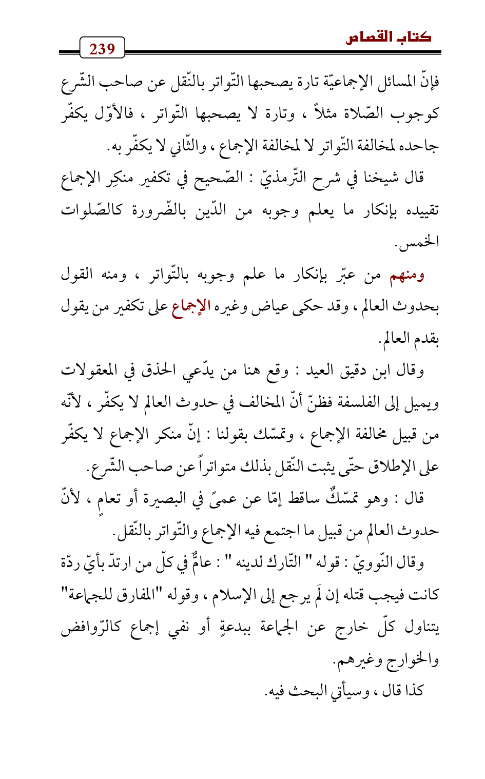 قال شيخنا في شرح التّرمذيّ: الصّحيح في تكفير منكِر الإجماع تقييده بإنكار ما يعلم وجوبه من الدّين بالضّرورة كالصّلوات الخمس.