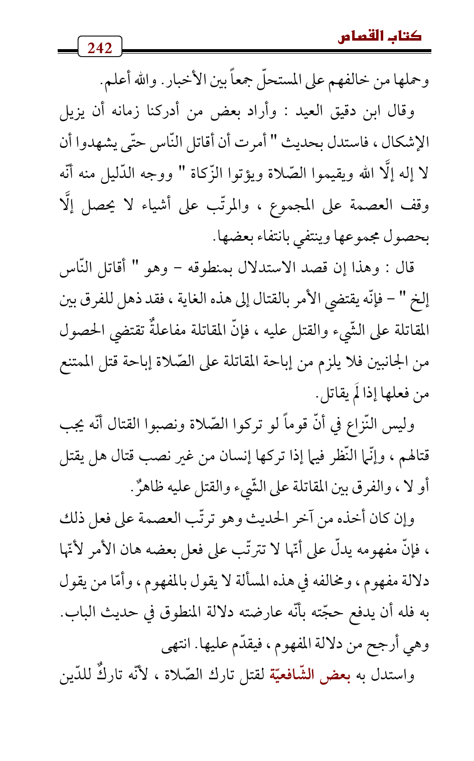 قال: وهذا إن قصد الاستدلال بمنطوقه - وهو " أقاتل النّاس إلخ " - فإنّه يقتضي الأمر بالقتال إلى هذه الغاية، فقد ذهل للفرق بين المقاتلة على الشّيء والقتل عليه، فإنّ المقاتلة مفاعلةٌ تقتضي الحصول من الجانبين فلا يلزم من إباحة المقاتلة على الصّلاة إباحة قتل الممتنع من فعلها إذا لَم يقاتل.