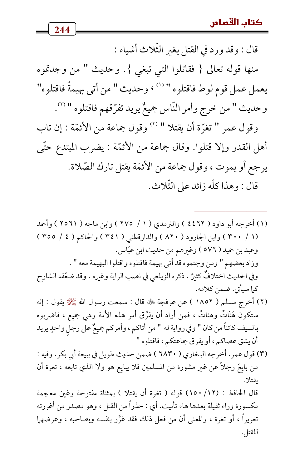 منها قوله تعالى {فقاتلوا التي تبغي}. وحديث " من وجدتموه يعمل عمل قوم لوط فاقتلوه " (¬1) , وحديث " من أتى بهيمةً فاقتلوه " وحديث " من خرج وأمر النّاس جميعٌ يريد تفرّقهم فاقتلوه " (¬2).