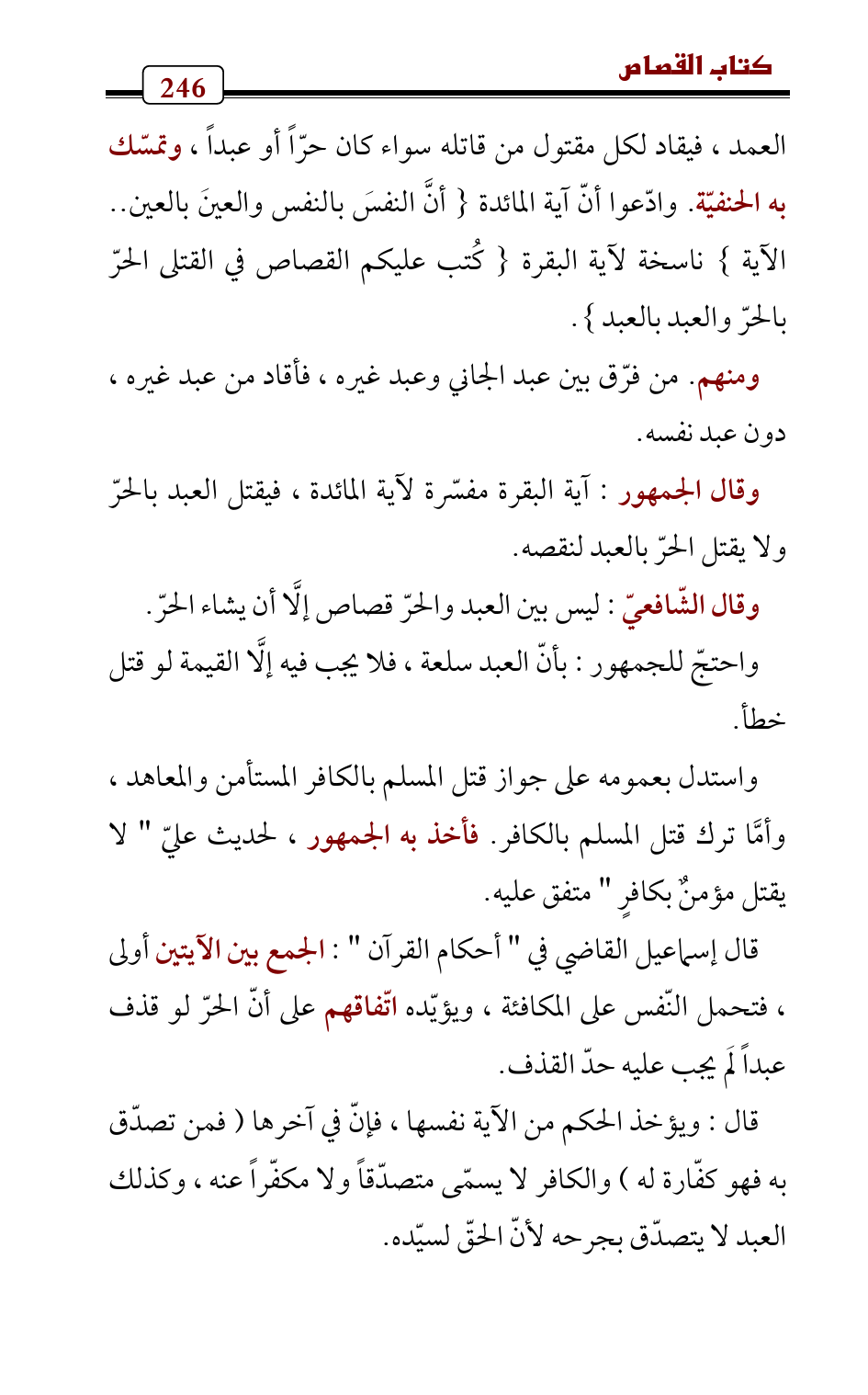 العمد , فيقاد لكل مقتول من قاتله سواء كان حرّاً أو عبداً، وتمسّك به الحنفيّة. وادّعوا أنّ آية المائدة {أنَّ النفسَ بالنفس والعينَ بالعين .. الآية} ناسخة لآية البقرة {كُتب عليكم القصاص في القتلى الحرّ بالحرّ والعبد بالعبد}.