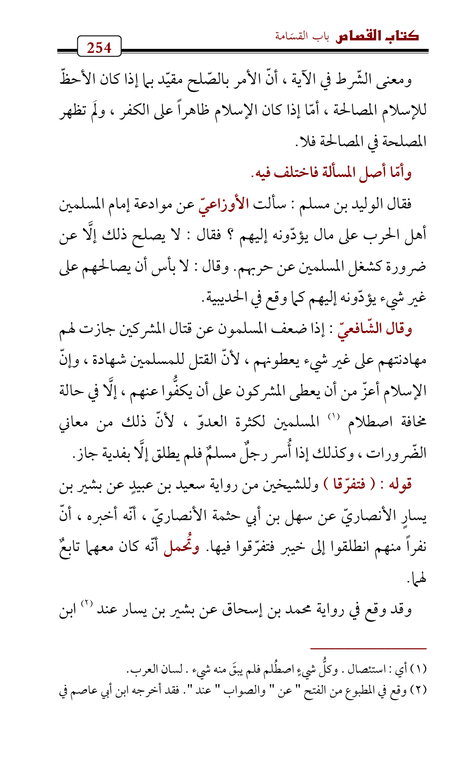 ومعنى الشّرط في الآية , أنّ الأمر بالصّلح مقيّد بما إذا كان الأحظّ للإسلام المصالحة، أمّا إذا كان الإسلام ظاهراً على الكفر , ولَم تظهر المصلحة في المصالحة فلا.